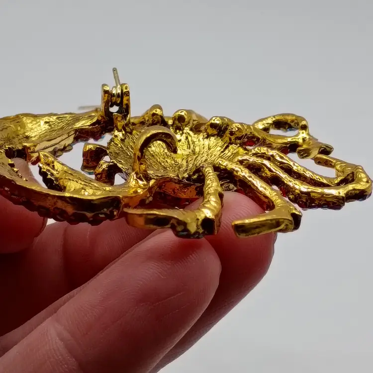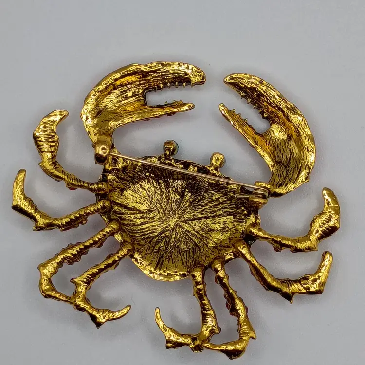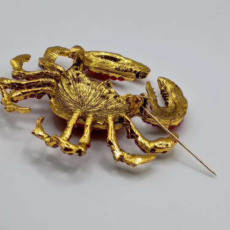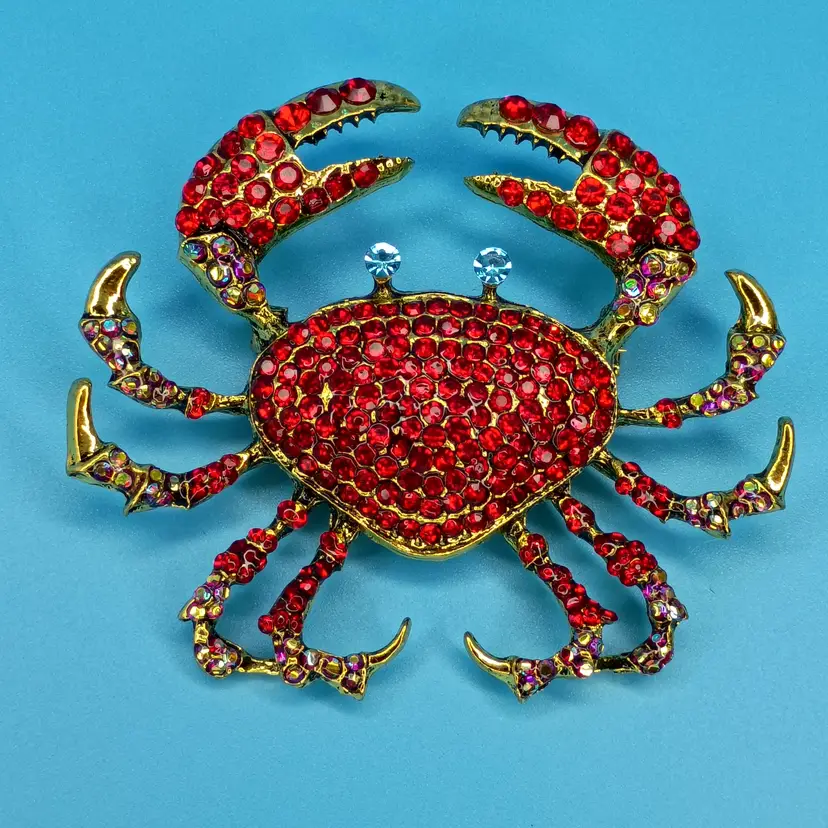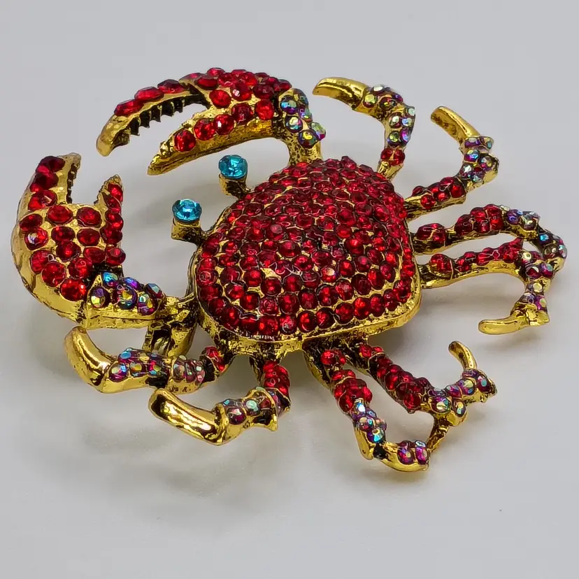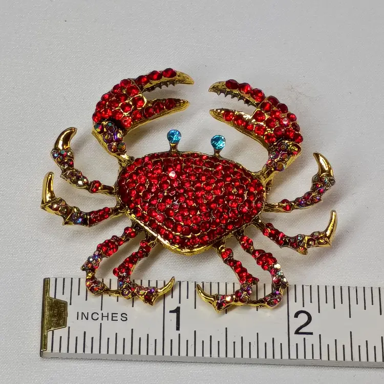 Sparkly red rhinestone crab brooch pin in gold tone with bright blue eyes and colorful accents on the legs and claws. Fun and bold statement piece with tons of personality and shine. Pin back works properly and brooch displays beautifully.