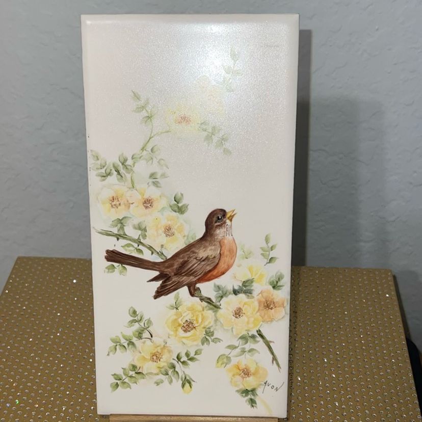 Off white/ivory Vintage Robin on branch with yellow flowers ceramic decor tile. Labeled Avon.
