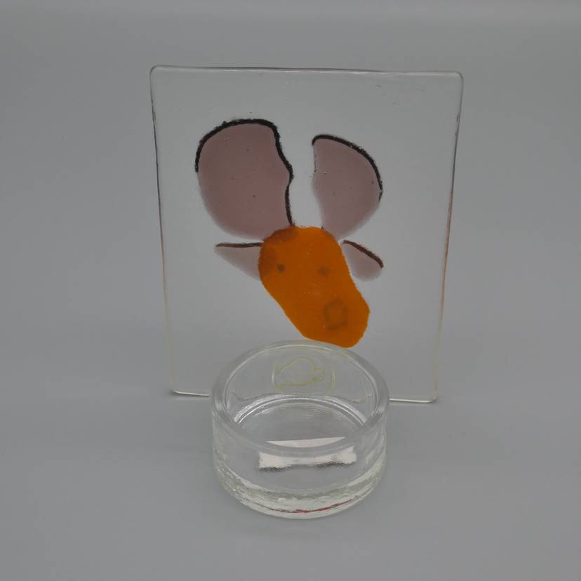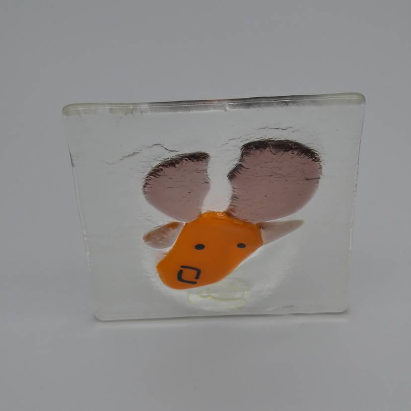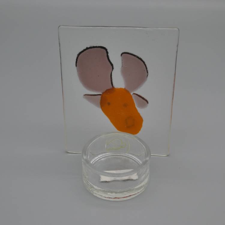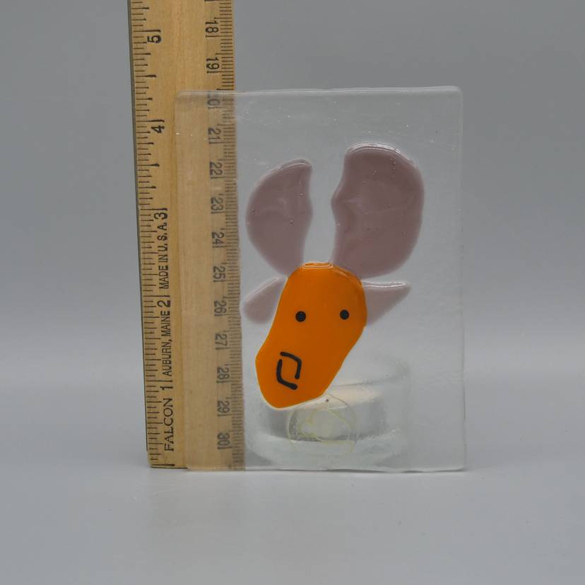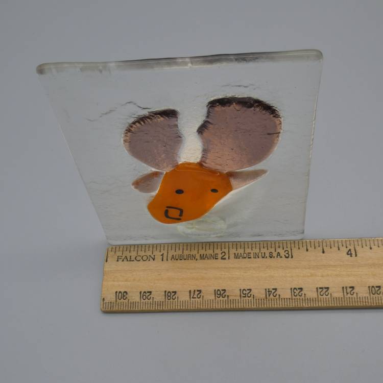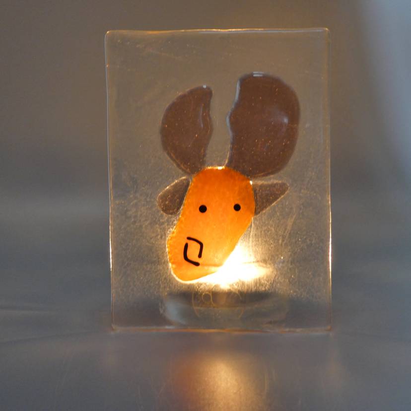 Featuring an adorable orange deer or moose with brown antlers and ears Clear glass background has an ice-like effect Hand-crafted fused glass with glass tealight candle holder Measures overall about 4-3/8" tall x 3-1/4" wide x 2-1/4" deep Round holder itself has an opening of about 1-1/2" across x 5/8" deep Weighs about 5.4 ounces before being packaged to ship