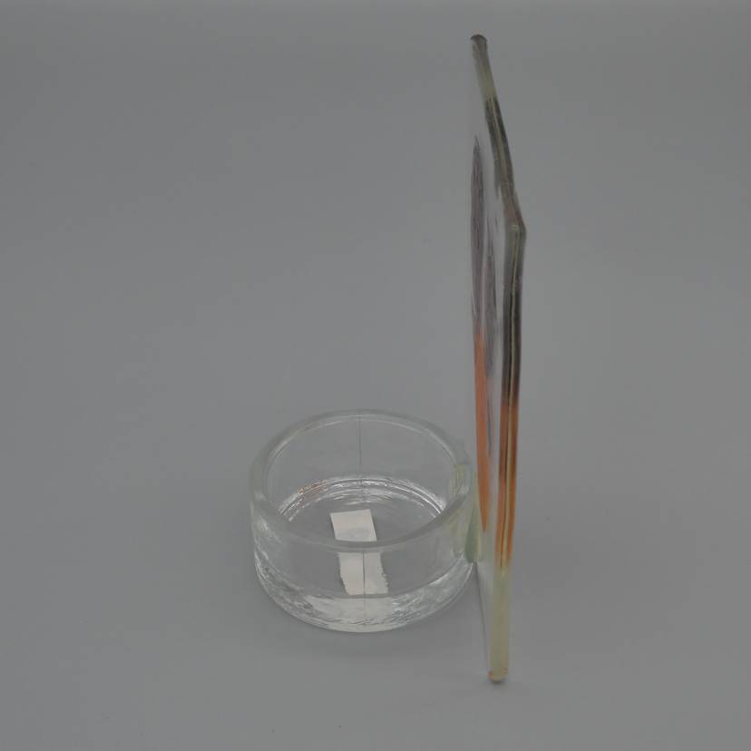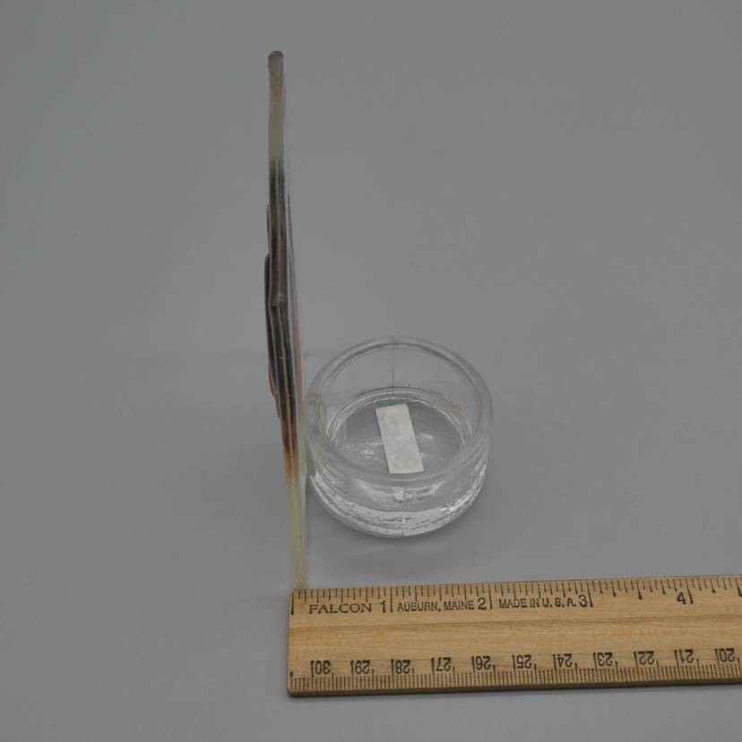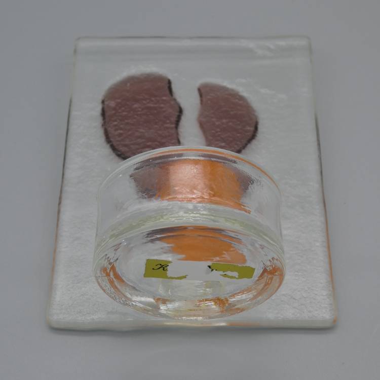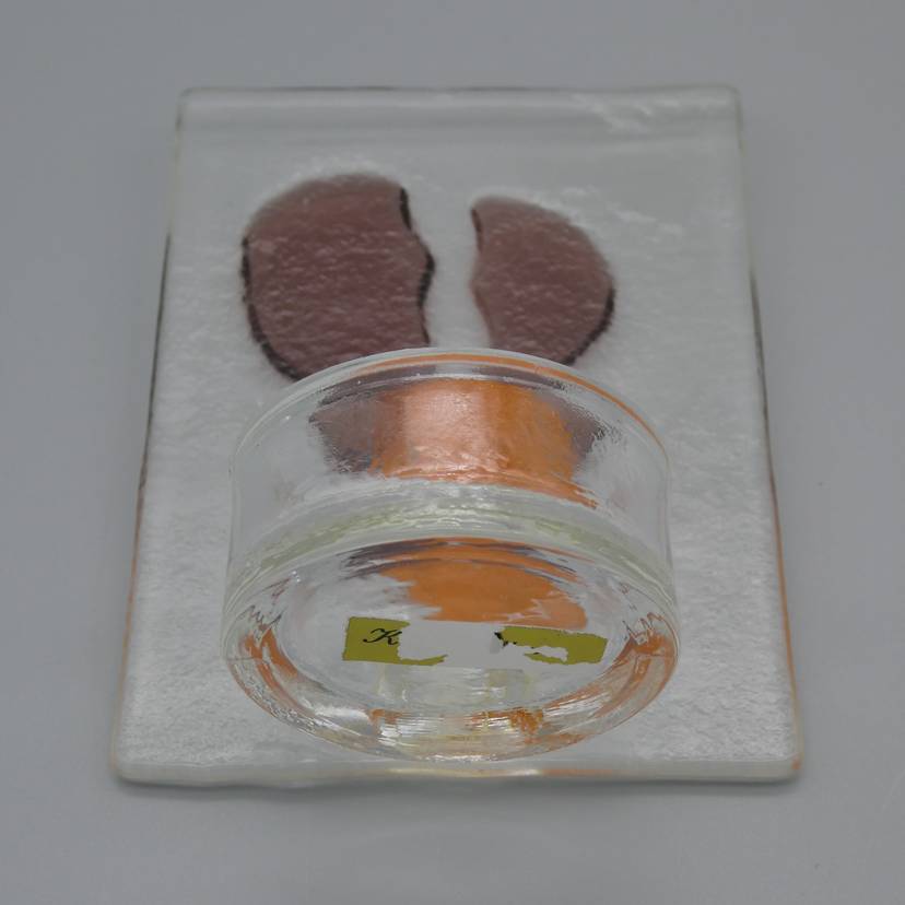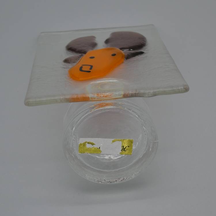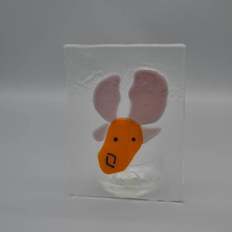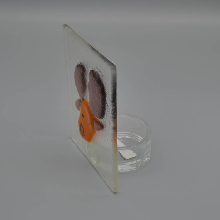Featuring an adorable orange deer or moose with brown antlers and ears Clear glass background has an ice-like effect Hand-crafted fused glass with glass tealight candle holder Measures overall about 4-3/8" tall x 3-1/4" wide x 2-1/4" deep Round holder itself has an opening of about 1-1/2" across x 5/8" deep Weighs about 5.4 ounces before being packaged to ship