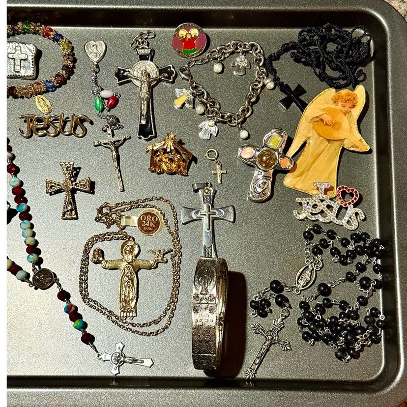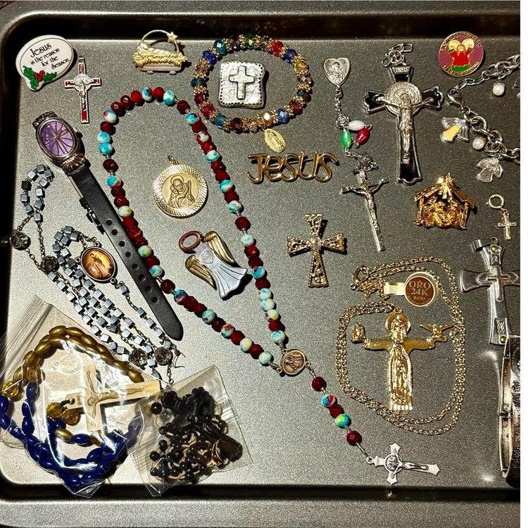 25 pieces: 7 brooches; 3 crucifixes; 5 rosaries (+1 rosary with hematites and faceted glass beads but no crucifix); 4 bracelets (1 is a charm bracelet); 2 charms; 1 watch; 1 necklace; 1 set of prayer beads w crucifix.