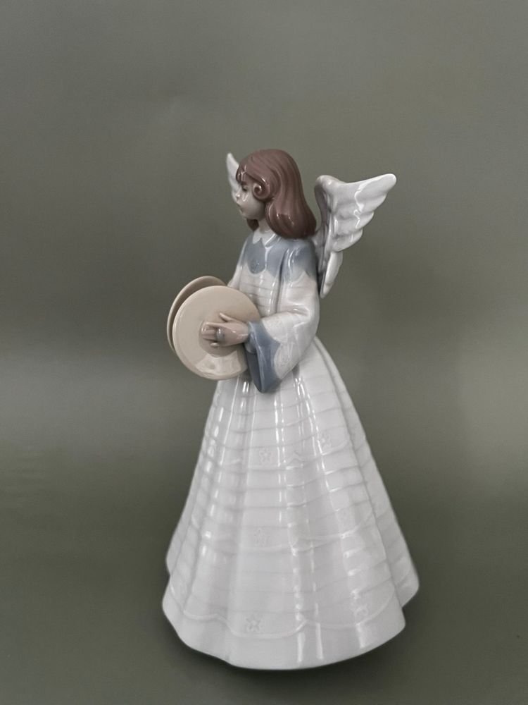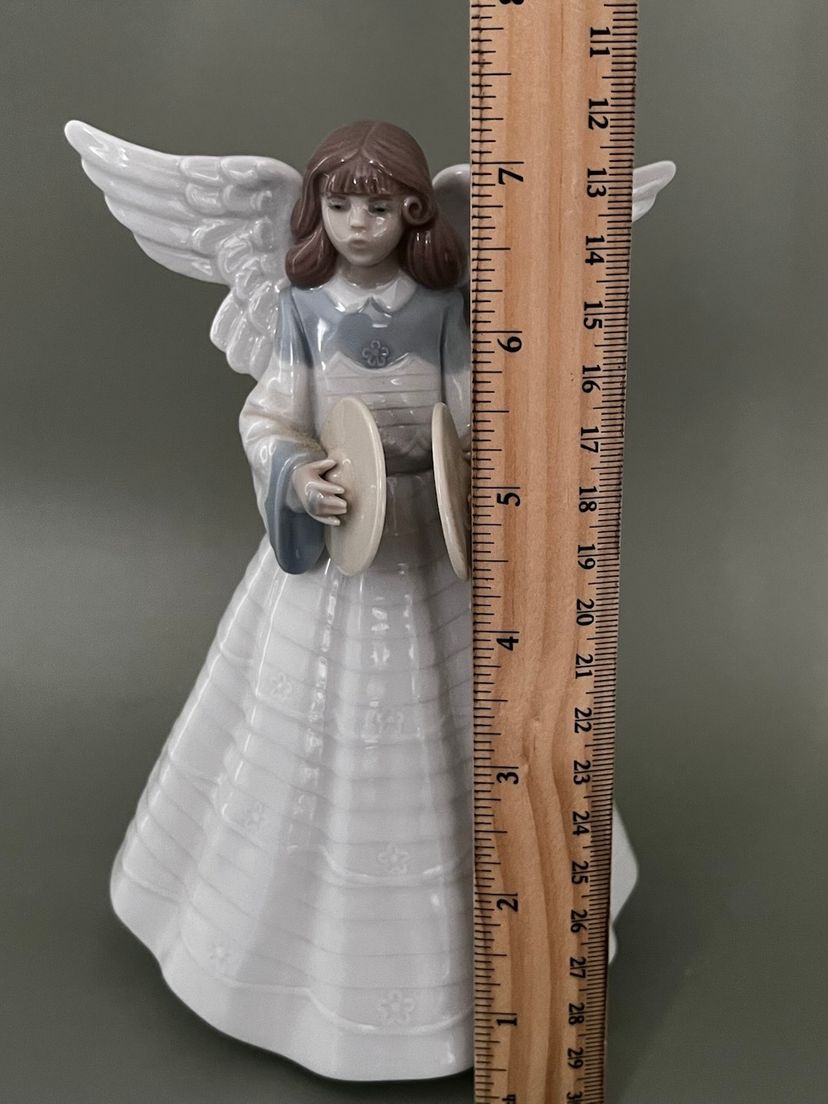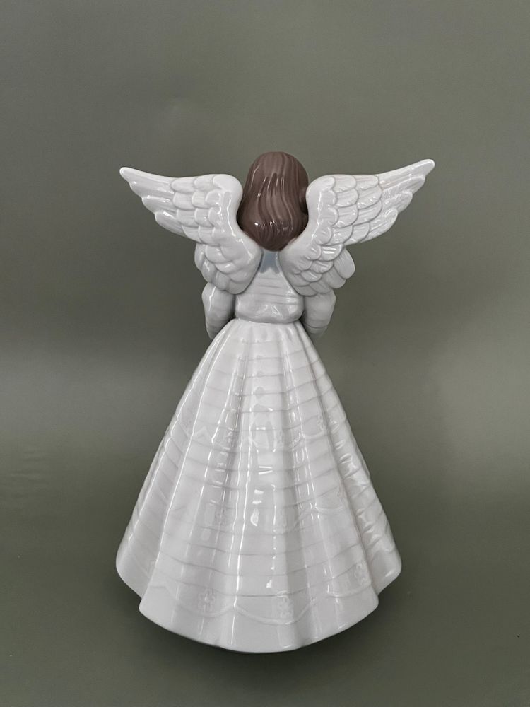 The Retired 1990 Lladró Angel Tree Topper 5876 Angelic Cymbalist is a beautifully crafted porcelain figurine, standing at 7 inches tall. This original piece from Lladró's Angel collection features a multicolor design, perfect for decorating a Christmas tree. Manufactured in Spain in the 1990s, this retired figurine of an angelic cymbalist adds a touch of nostalgia and elegance to any holiday decor.