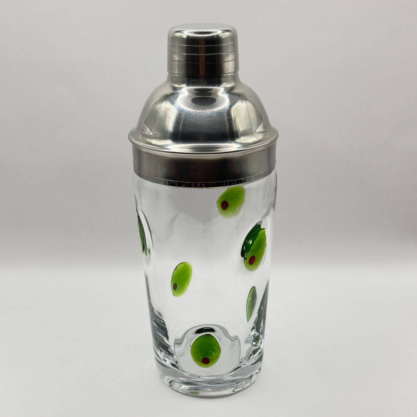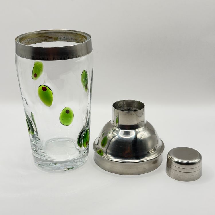 Shake up your cocktail game with this retro glass cocktail shaker, featuring a fun olive design. Perfect for adding a touch of mid-century charm to your home bar. In excellent condition with no chips or cracks. Measures 4x9x4 inches. Weighs 2lb.
