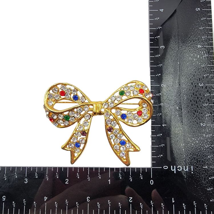 In the world of adornments, this bow brooch tells a tale of elegance and charm. Its gold tone whispers of vintage allure, while the multi-colored rhinestones dance like stars across a midnight sky. Crafted with care, it promises to bring a touch of whimsy and sophistication to any ensemble.