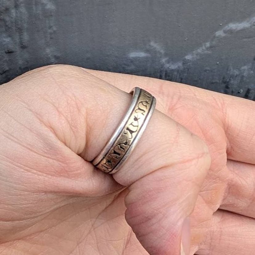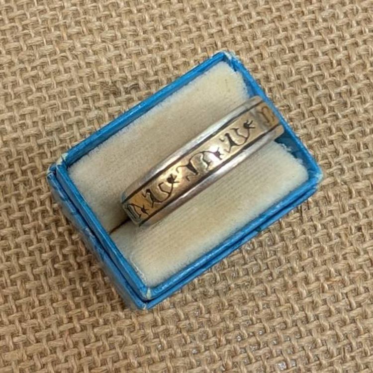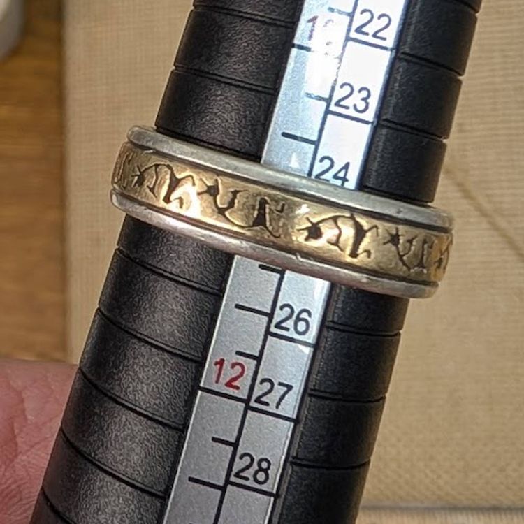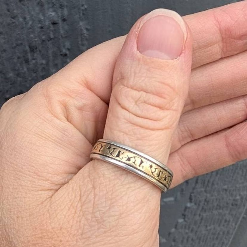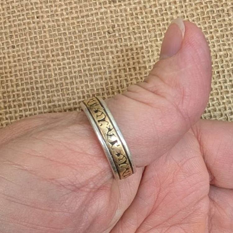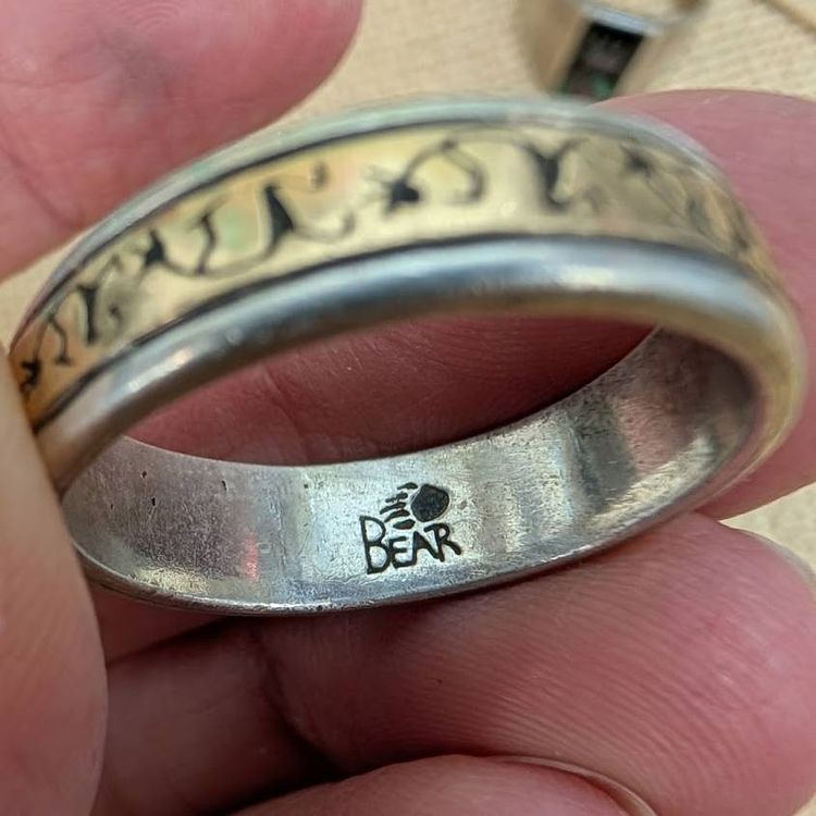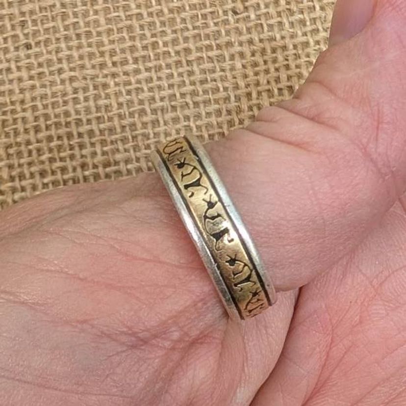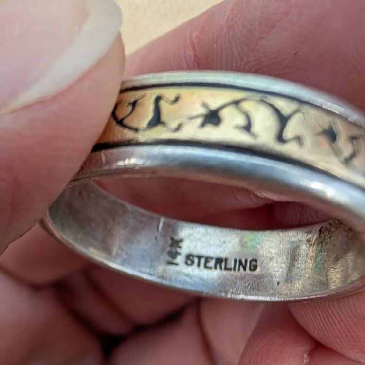 Nice, sterling silver band with 14k overlay. Features a ring of Kokopelli dancers. Marked on the inside. In nice, used condition. Size 11