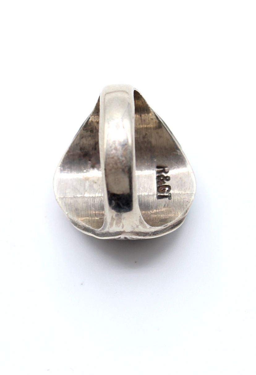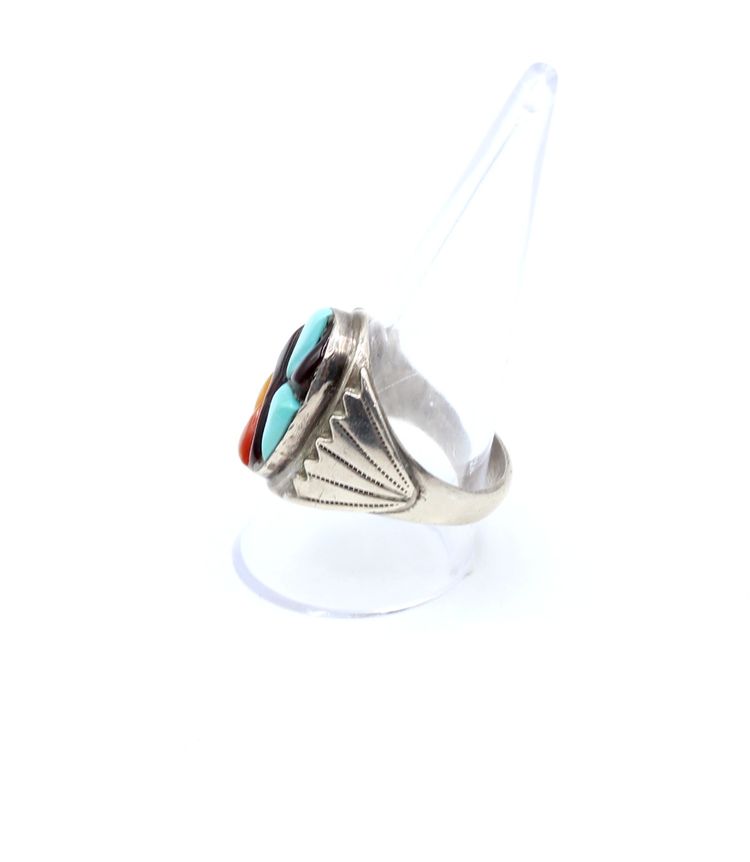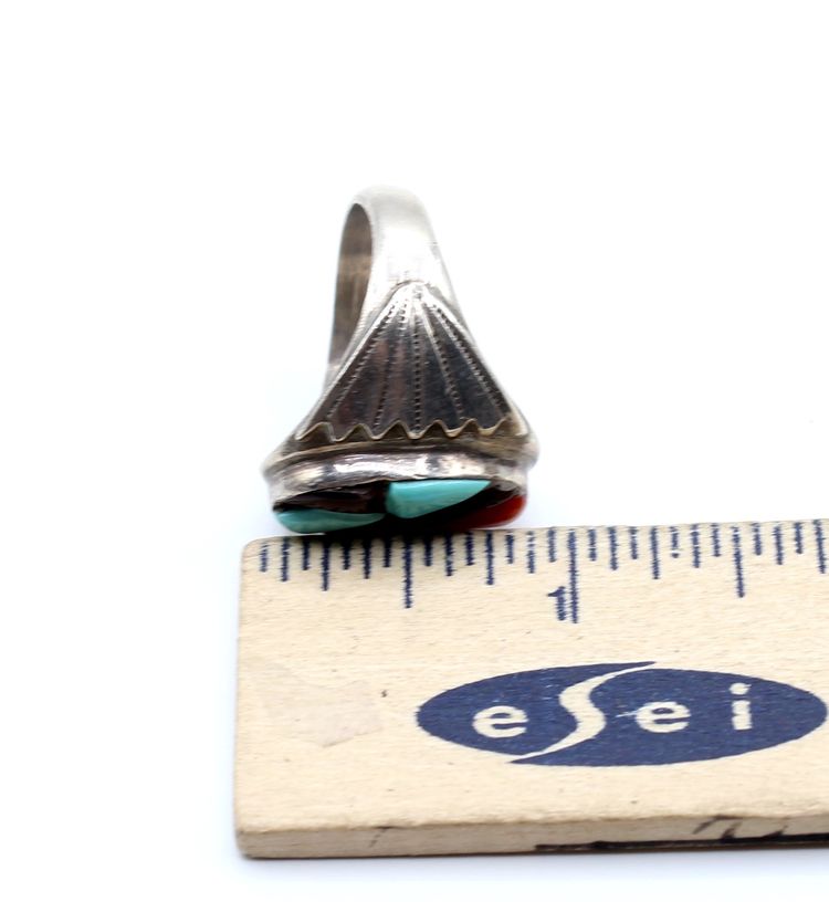 Beautiful signed R. & GT turquoise, onyx, MOP & coral ring. Richard being of Mexican decent and Geneva Zuni Husband and wife. Inlay set in smooth bezel with fan design on 5mm band.