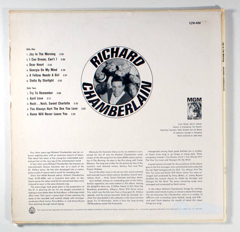 Joy in the Morning, by Richard Chamberlain, released by MGM Records during the peak of his teen idol fame from starring in the TV series Dr. Kildare. The album features standards and themes, including the title track, which Chamberlain performed in the 1965 MGM film adaptation of Betty Smith's novel Joy in the Morning, marking a significant crossover from his acting career into music. Historically notable as one of Chamberlain's four chart albums in the early 1960s, it reflects the era's trend of television heartthrobs leveraging their fame with light ballad recordings, though it was less commercially successful than his earlier works. The tracklist includes romantic ballads like I Can Dream, Can't I?, Dear Heart, Georgia on My Mind, and Stella by Starlight, highlighting Chamberlain's smooth baritone with orchestral backing. The single Joy in the Morning, tied to the film, received modest airplay but did not reach the Billboard Hot 100.