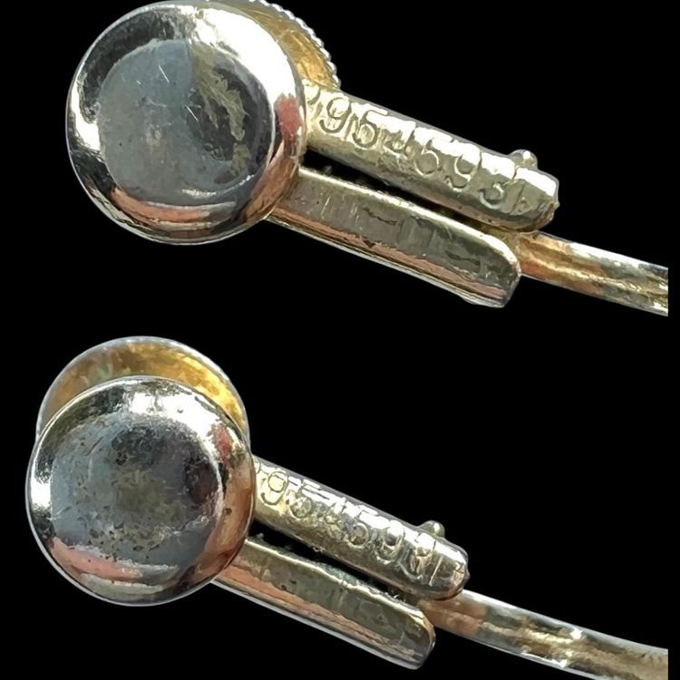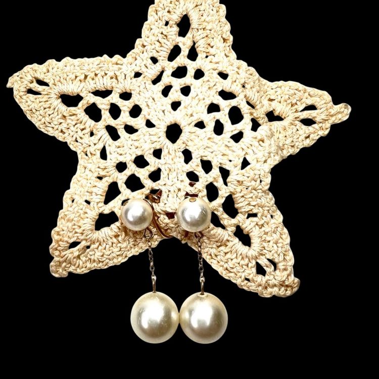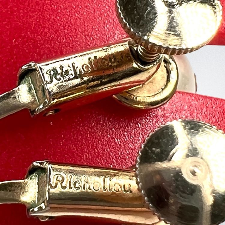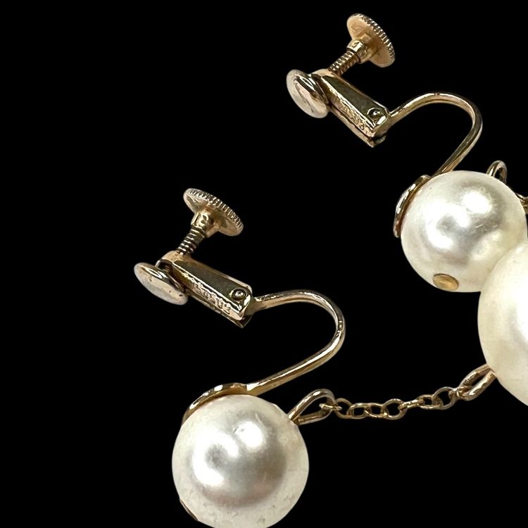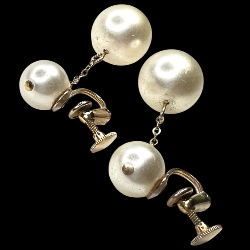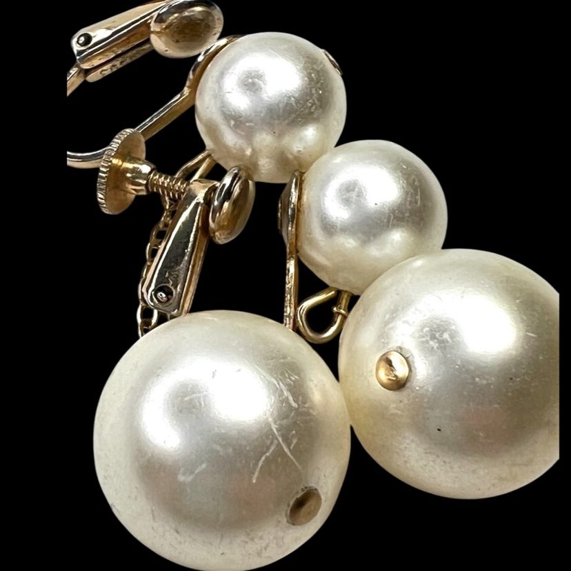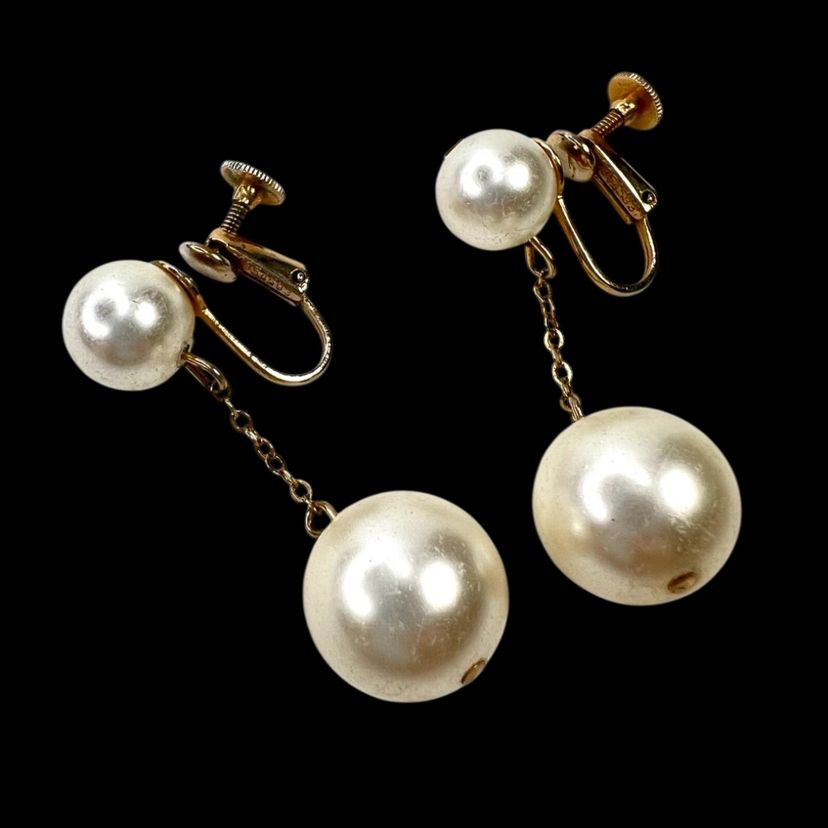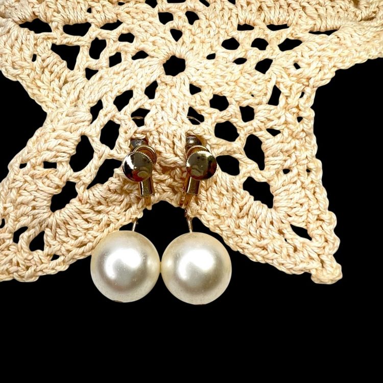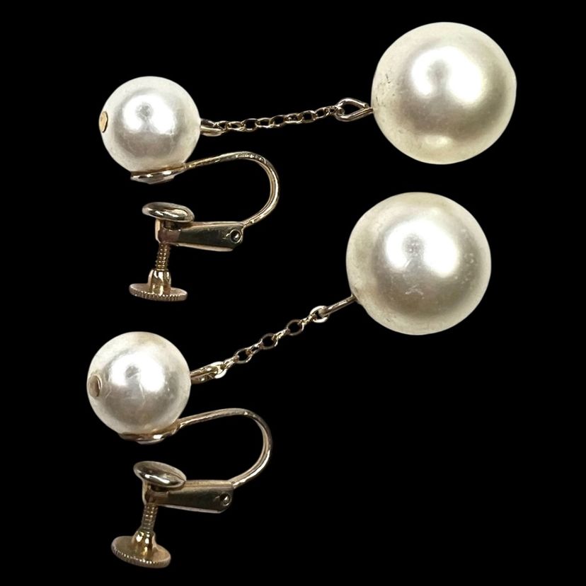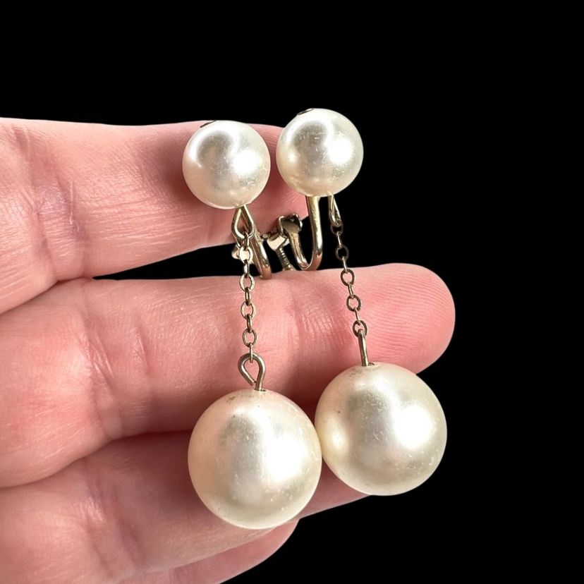 Vintage gorgeous! Mid-Century Faux Pearl Screwback Earrings. Gold-tone. Signed “Richelieu” & With Numbers. See last 2 close-up photos. 1-1/2” Drop. Smaller Pearl is 3/8”. Larger Pearl is 1/2”. Condition is good with no rust on metal. I polished them up so gleam wonderfully. Faux pearls do have scratches as seen in photos. Note: Doily in photos not included. It is just a photo prop.