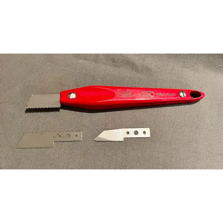 Includes two extra blades (see photo). From Rob’s site: The knife body is made of cast metal and is surprisingly hefty. Two piece body with space to store a second blade. The rectangular handle will register in your hand to help you “feel” the blade's position. Comes with our .019" (19 Thousandths of an inch) Saw-Tooth Blade. Replacement blades available. Regular Saw-Tooth Blade: Designed specifically for use with my dovetail transfer technique. Made of the same material as our saw plates, with a .019 inch thick kerf. .019 Saw Tooth Blade has 22 TPI so it fits into the kerf easily. Allows you to "saw" a starting kerf in the pin-board.