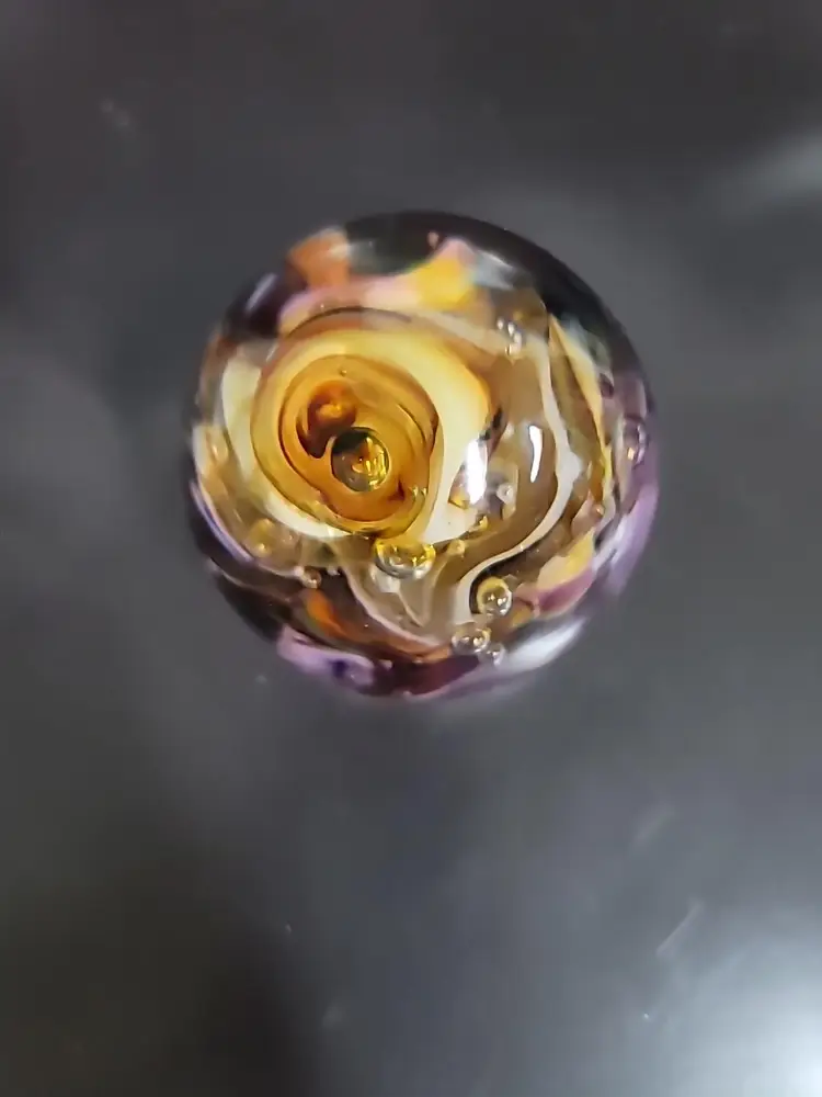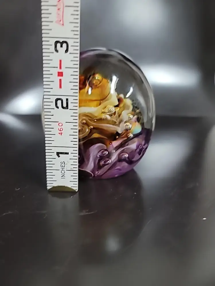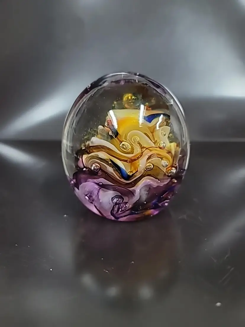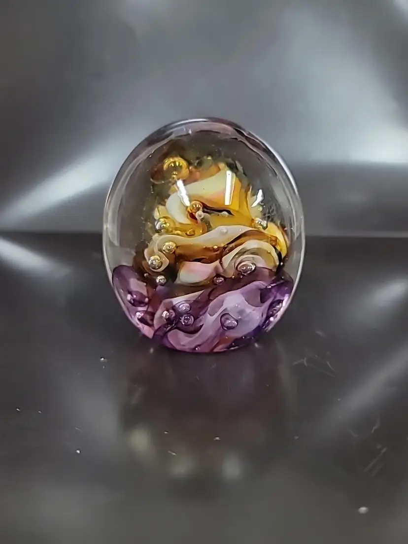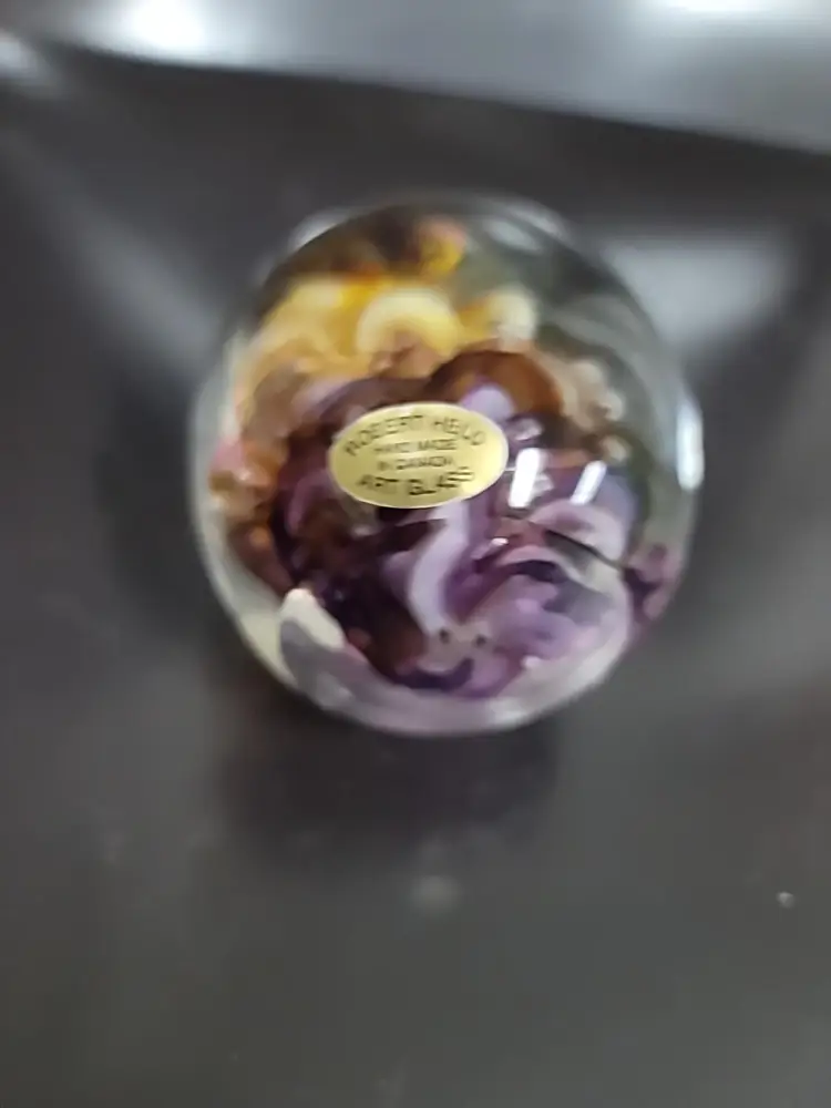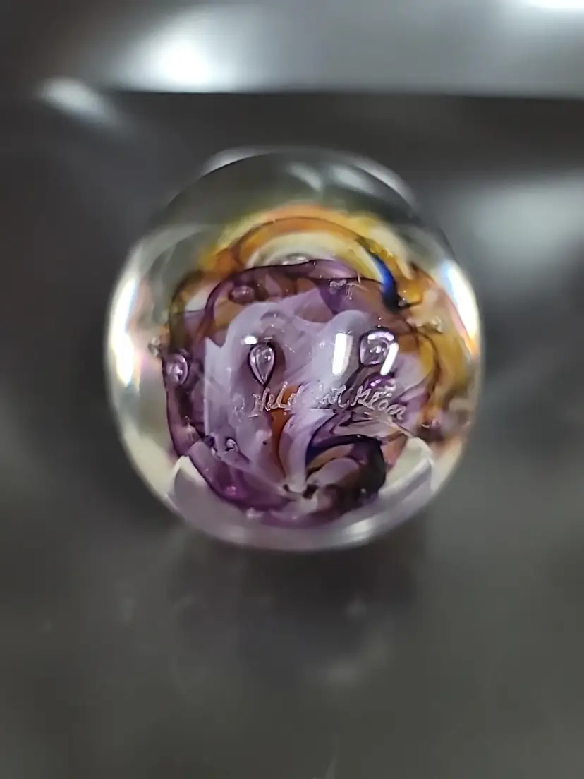 Beautiful art glass paperweight by Robert Held. Purple, pink, yellow, orange and hints of blue swirl through the controlled bubbles of the paperweight. Etched signature and studio sticker. Smooth polished bottom, no chips or cracks. It measures approximately 3.5" x 3"