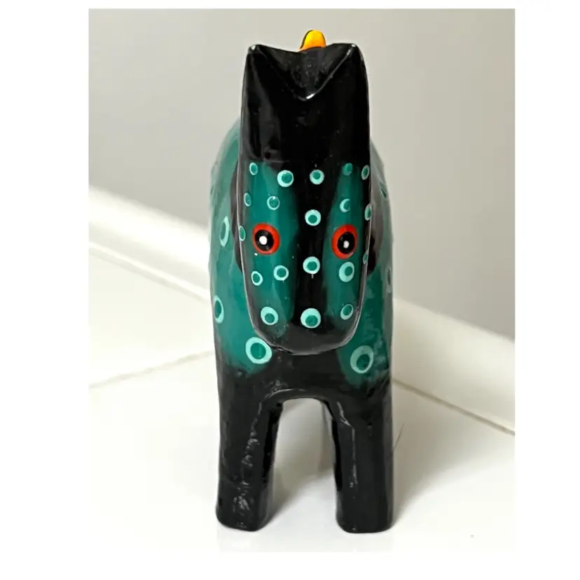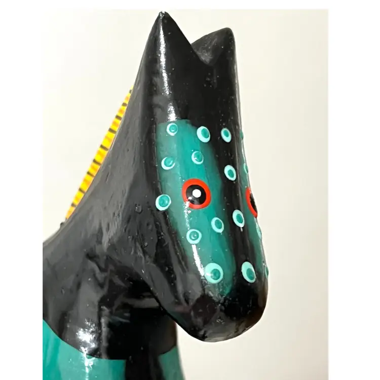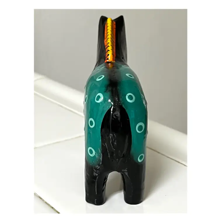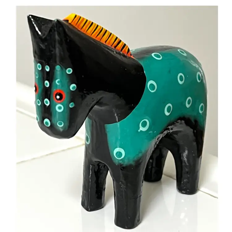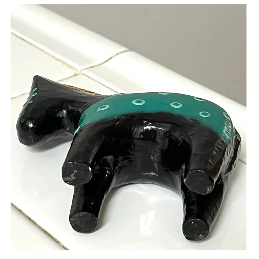 Robert Shields Hand Painted Horse Black Teal Yellow Ceramic Figurine. MCM. 4.5 in Height, 4.5 in Length. No chips/cracks