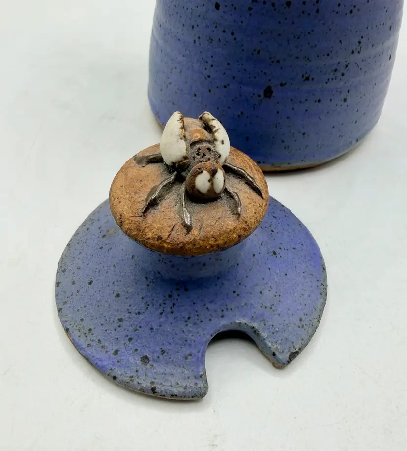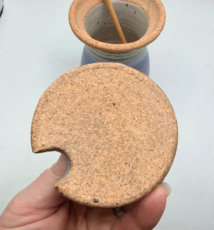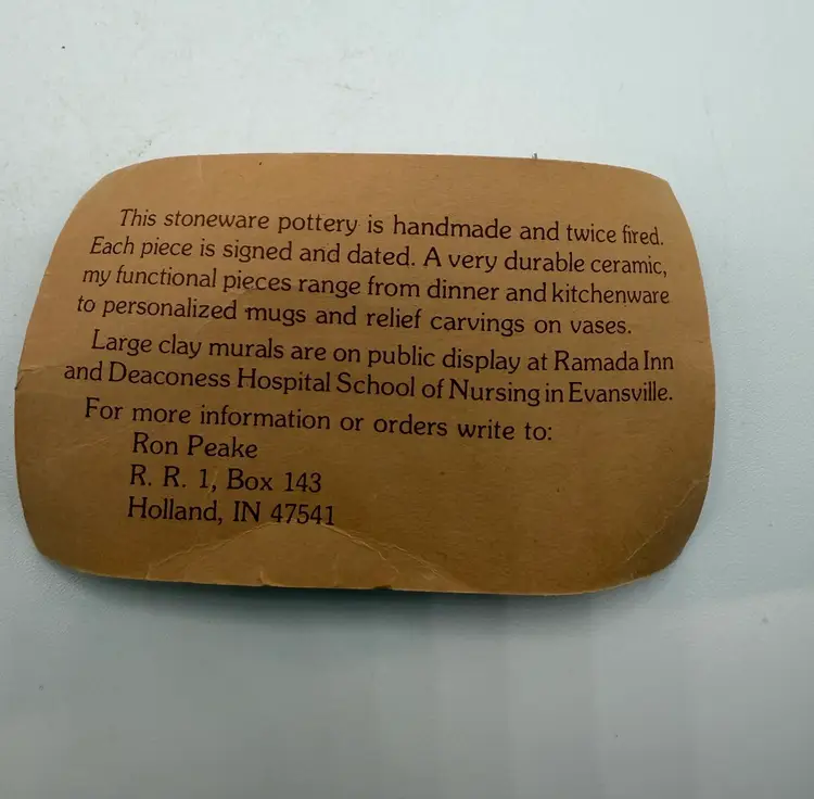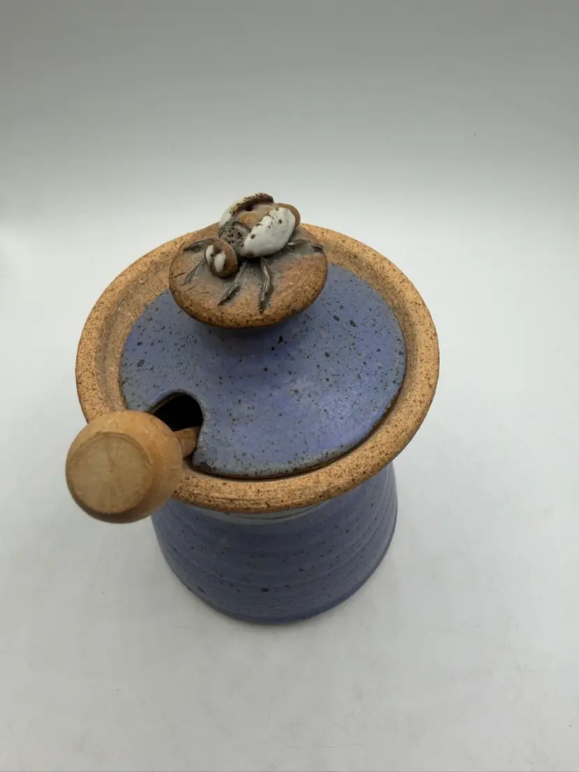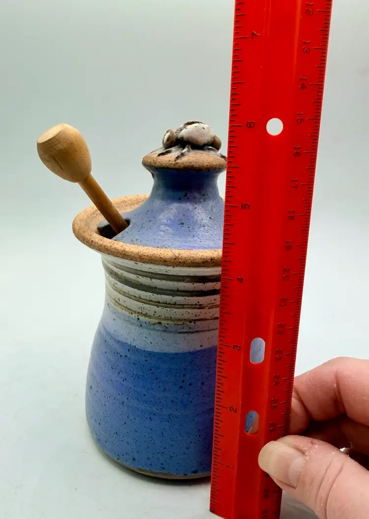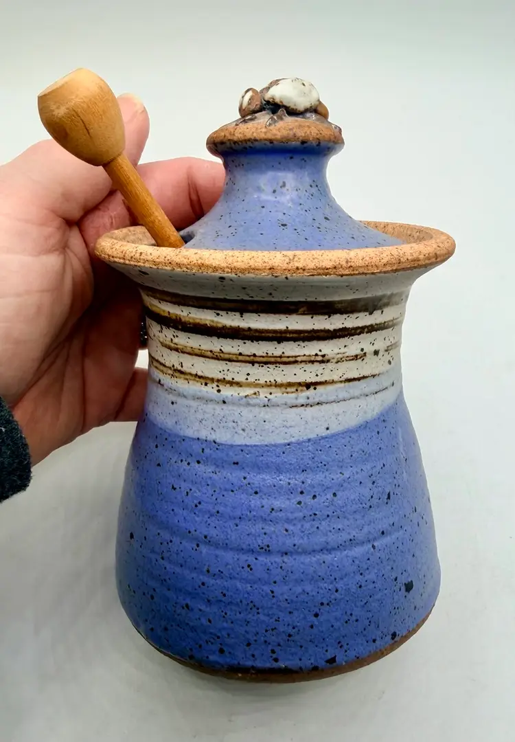 The Ron Peake Studio Pottery Honey Pot is a charming stoneware jar with a lid, featuring a beautiful blue banded design. This unique piece is handcrafted in Indiana by the talented artist Ron Peake, making it a special addition to any kitchen or dining table. The honey pot stands at 6 inches tall, perfect for storing and serving your favorite honey or preserves. With its rustic appeal and American craftsmanship, this pottery honey pot is sure to be a conversation starter and a cherished item for any home.