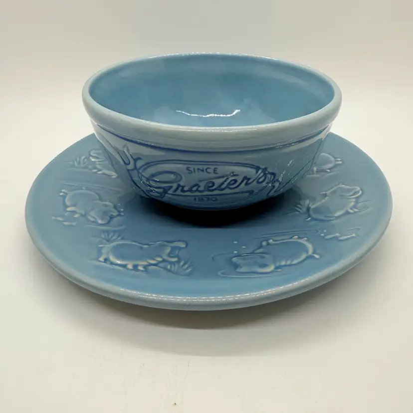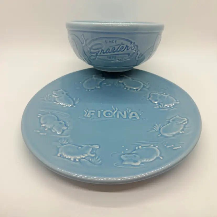 Rookwood Pottery Fiona the Hippo Dessert Plate & Graeter's Ice Cream Bowl Set. No chips or cracks. Signs of wear and use - light scratching and scuffing to the face plate. Please see pictures.