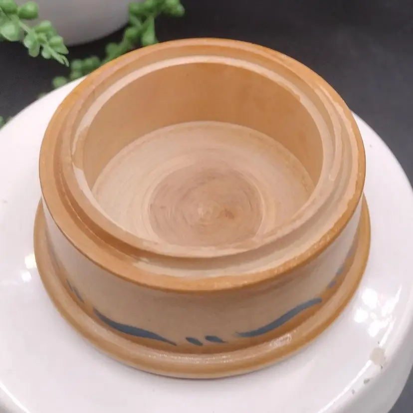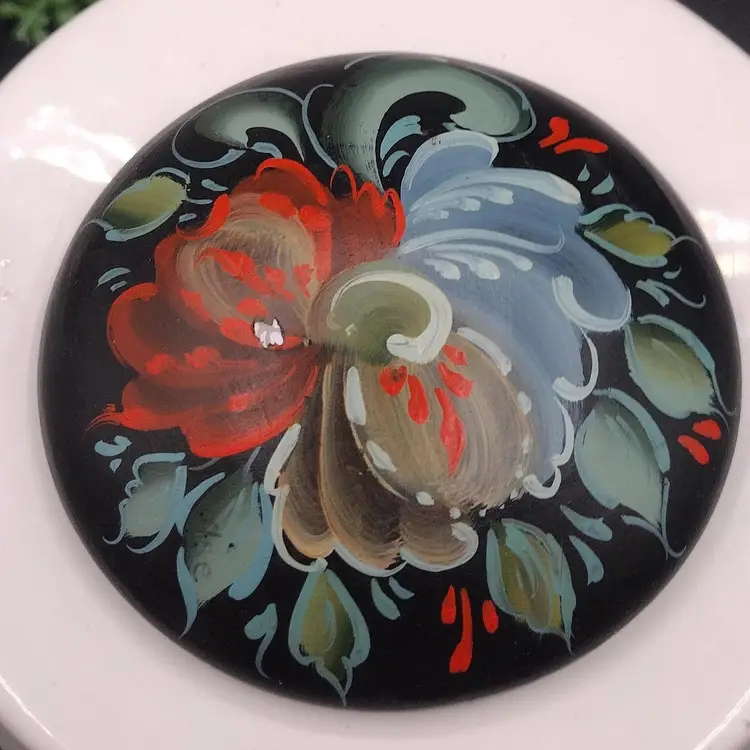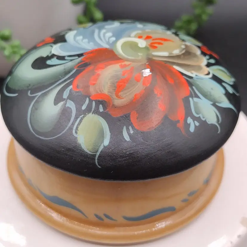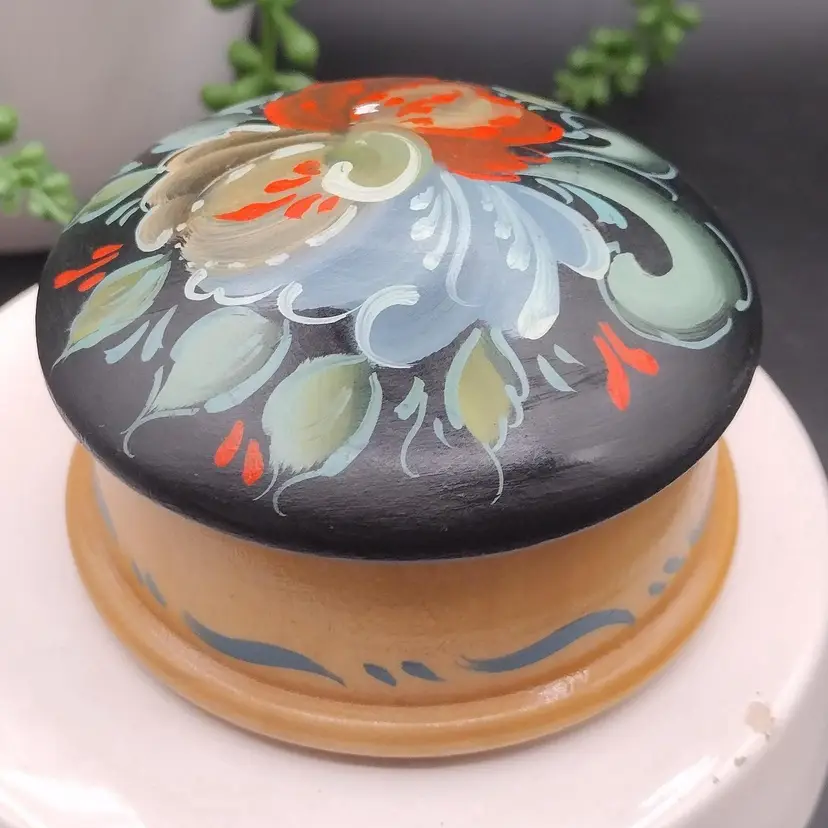 This is a hand-painted round wood trinket box featuring a traditional Scandinavian/Nordic rose design known as Rosemaling. The box has a diameter of 3 1/4 inches and a height of 2 inches, making it suitable for storing small items such as jewelry or keepsakes. The multicolored floral pattern adds a touch of folk art to any room, and the handmade wooden construction gives it a rustic charm. Preowned There is a small chip on the paint -- please see photos.