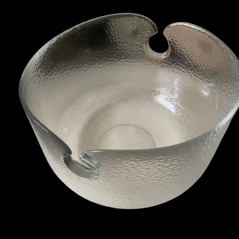 This is a vintage Rosenthal Studio Line glass bowl designed by Zsofia Kanyak. It is made of heavy, clear glass with a textured "hammered" surface. The design, featuring unique side openings, is often referred to as "spun glass" or a "yarn bowl" (due to the openings). Kanyak was a Hungarian designer who worked for Rosenthal from 1967 until her death in 1975. Rosenthal is a renowned German manufacturer of luxury household goods, known for its quality crystal and porcelain.