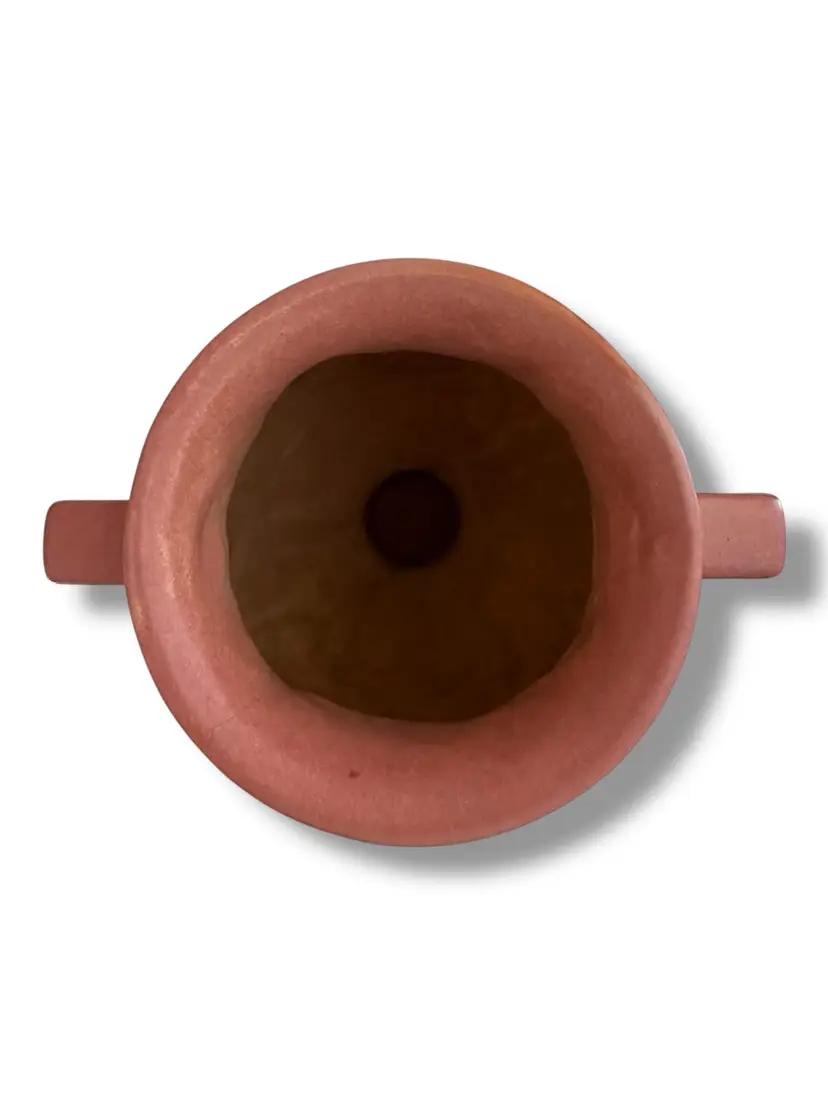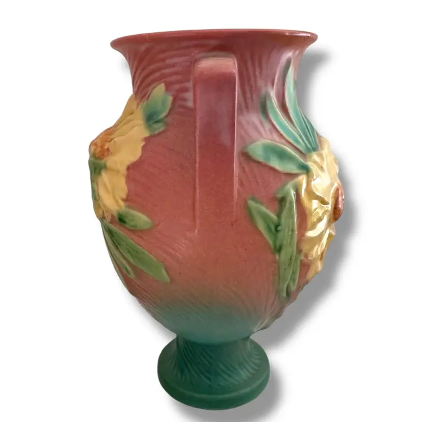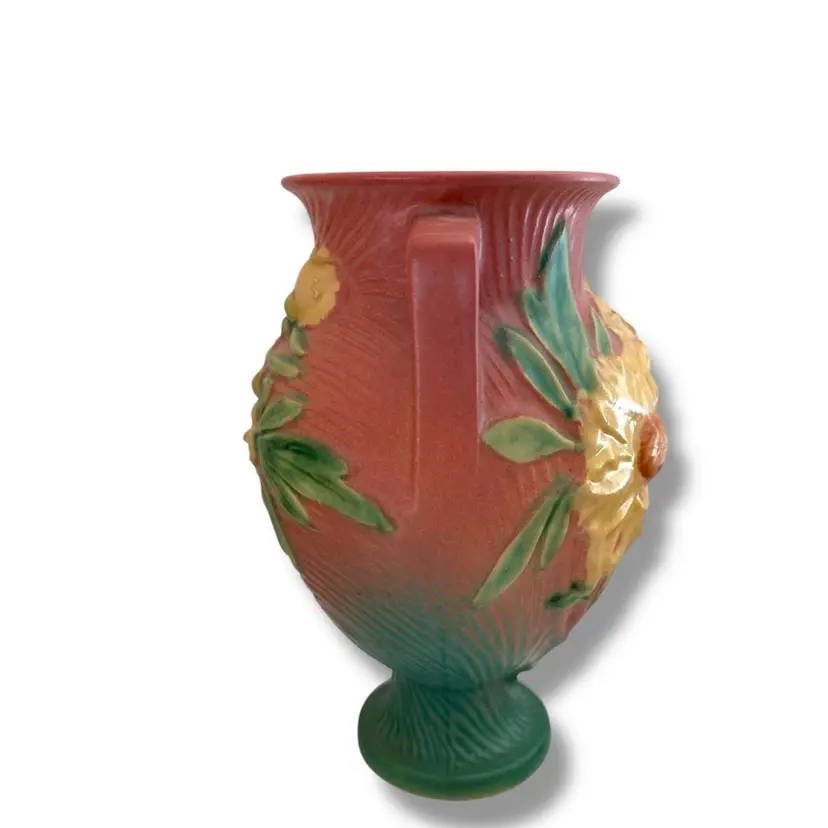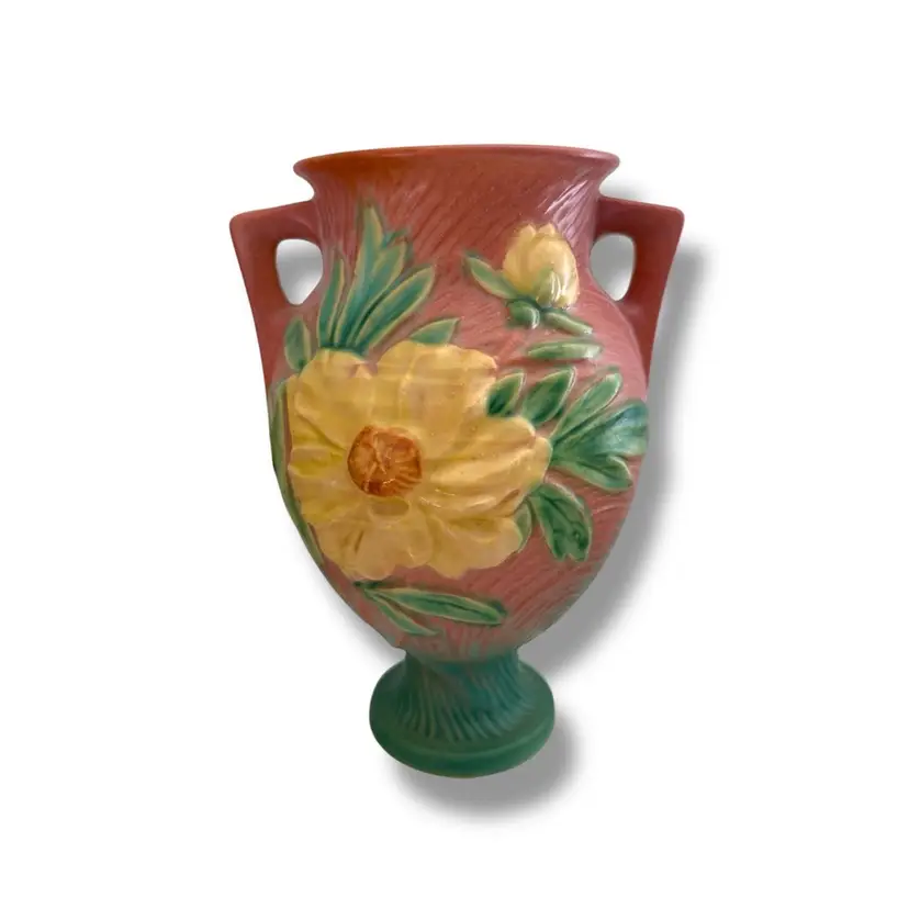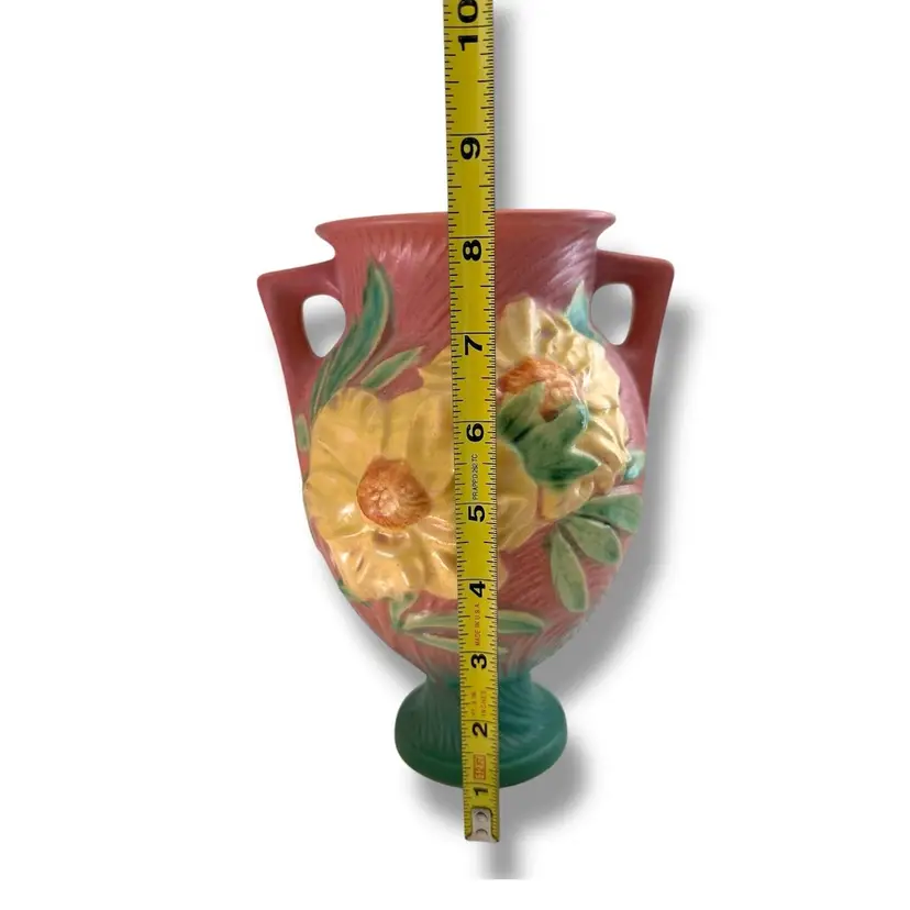 Roseville Peony Double Handle Vase #169 - 8" Pink Green Matte Glaze With Yellow Blossoms Vintage Art Pottery Zanesville Ohio 1930s.