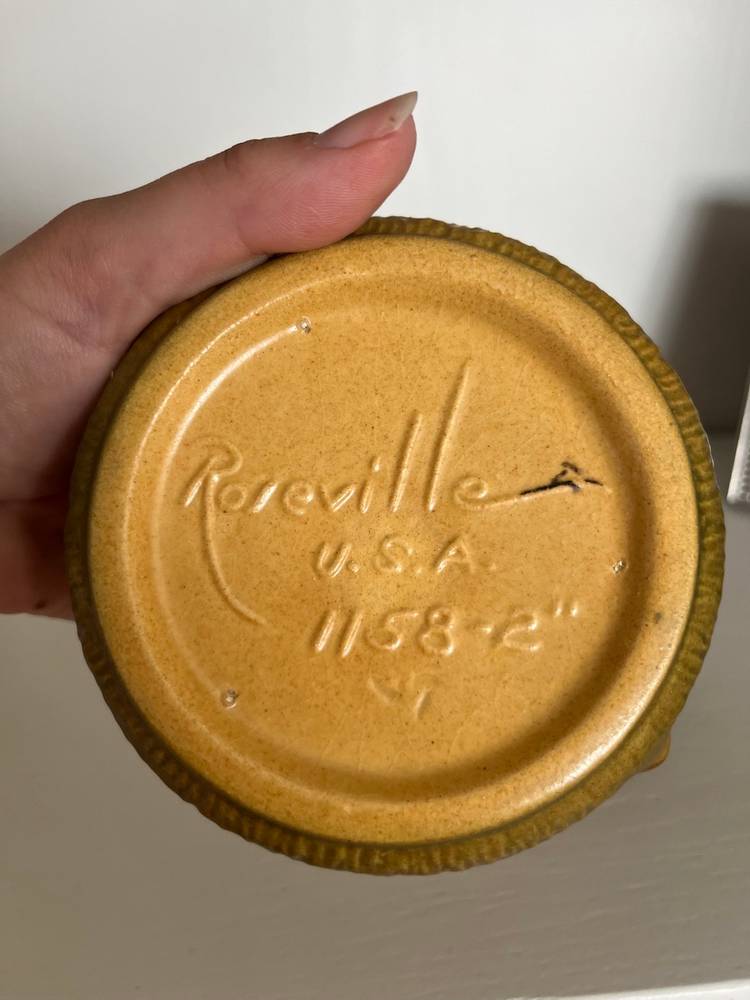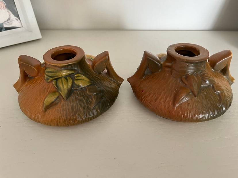 The product is a pair of vintage Roseville Pottery Clematis candle holders from the 1940s. These North American-made clay candle holders feature a floral pattern in a brown color, typical of the Art Deco style popular during the mid-20th century. With an impressed backstamp and a matte finish, these original candle holders are a charming addition to any decor, showcasing the intricate craftsmanship and unique design of Roseville Pottery during that era.