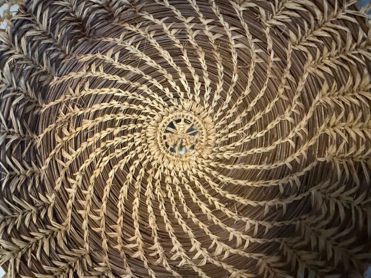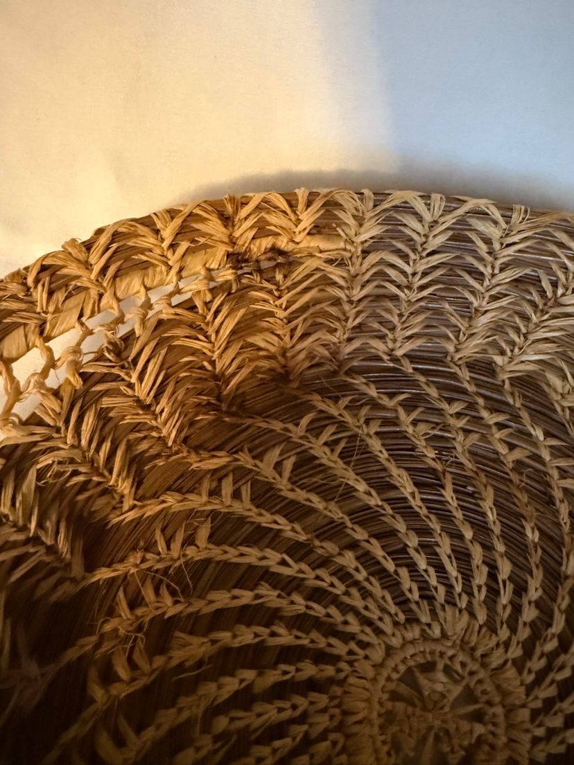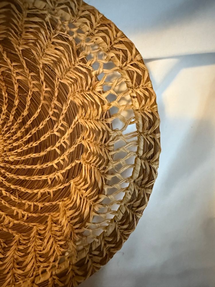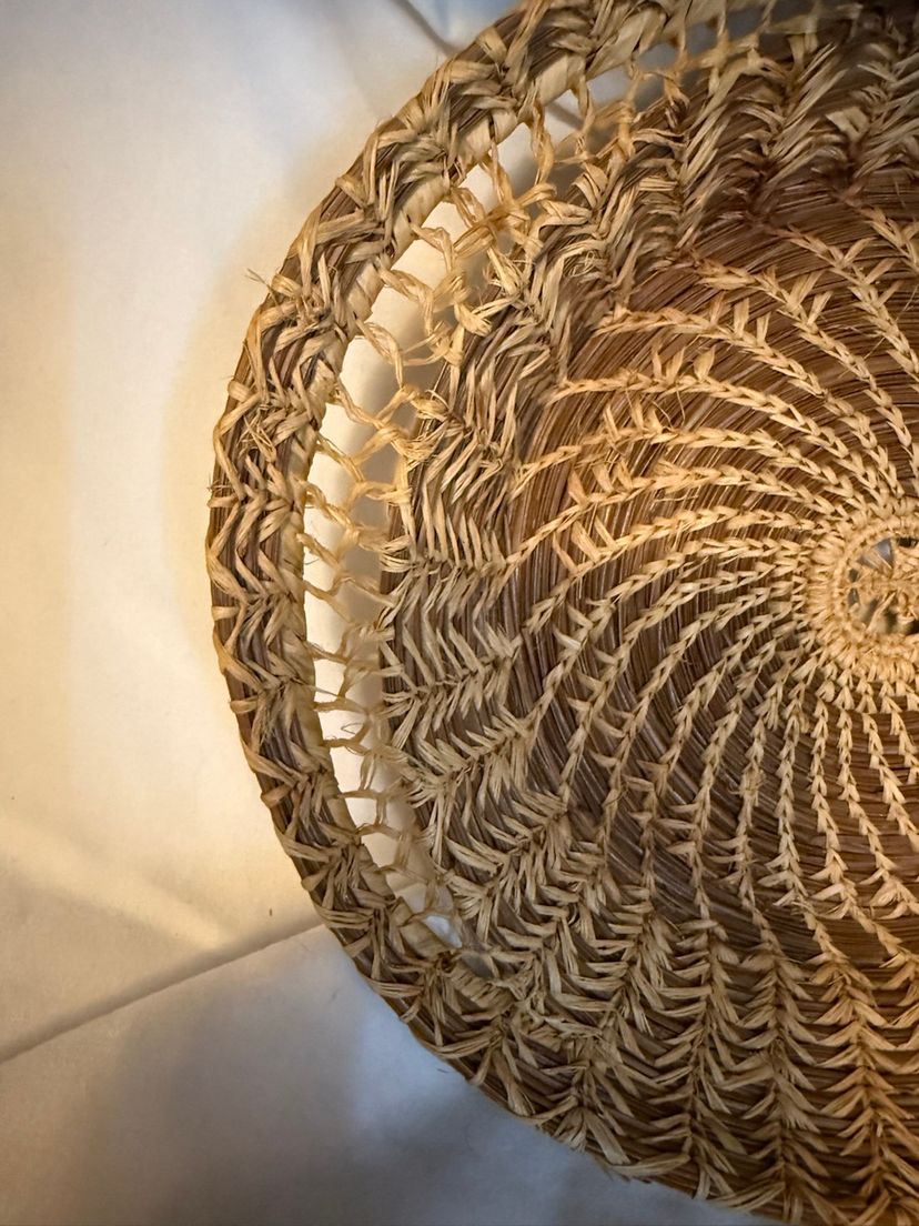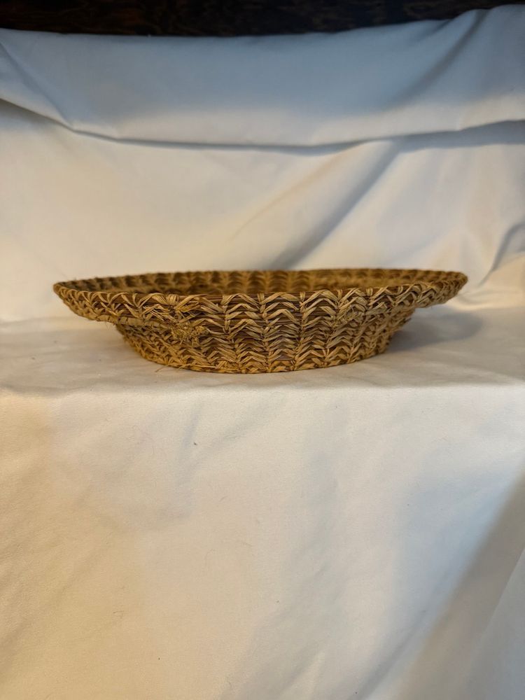 Delicate tray with woven pinwheel design. Perfect for bread or rolls! Measures 10 inches in diameter and is approximately 2 inches high.
