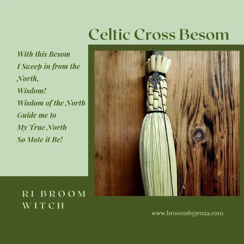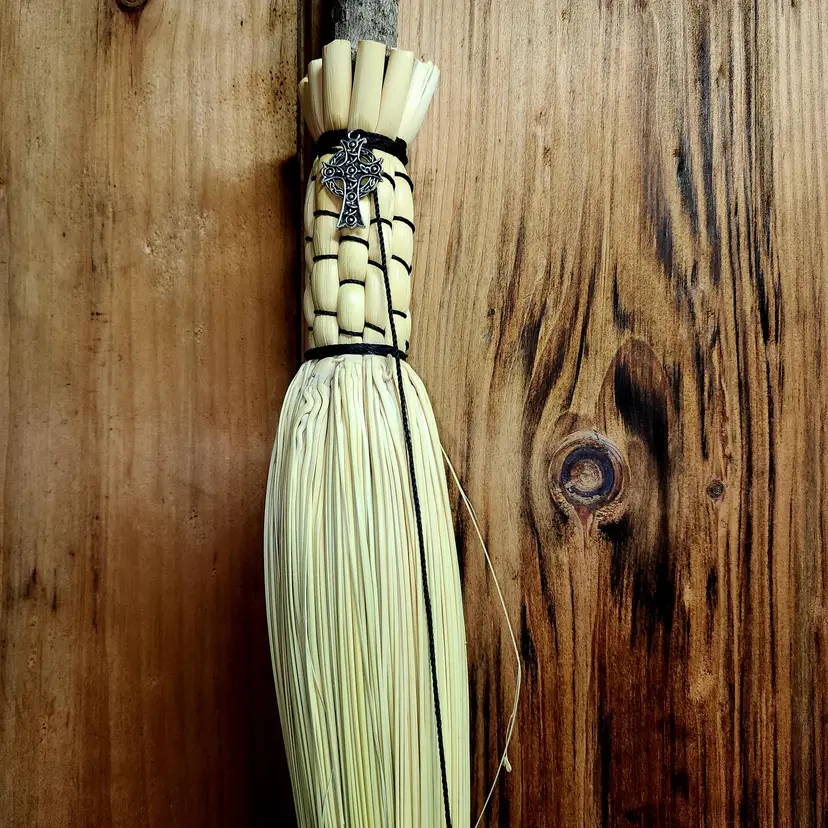Black twine, Round Hearth Besom with Celtic Cross Charm. From top of handle to bottom of sweep approx 47 in