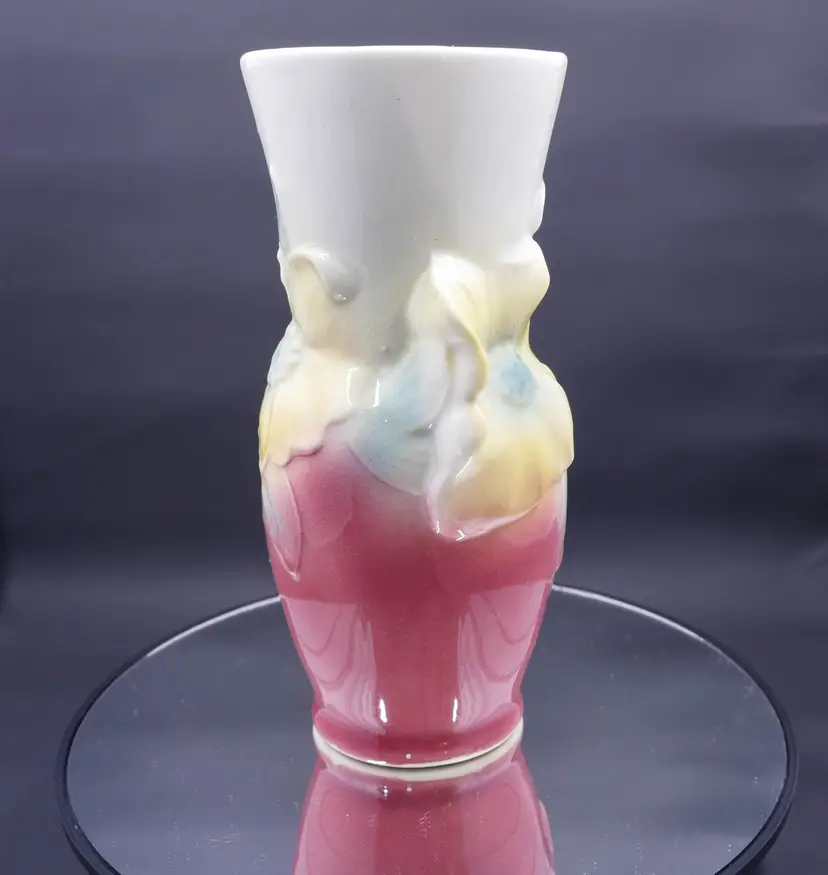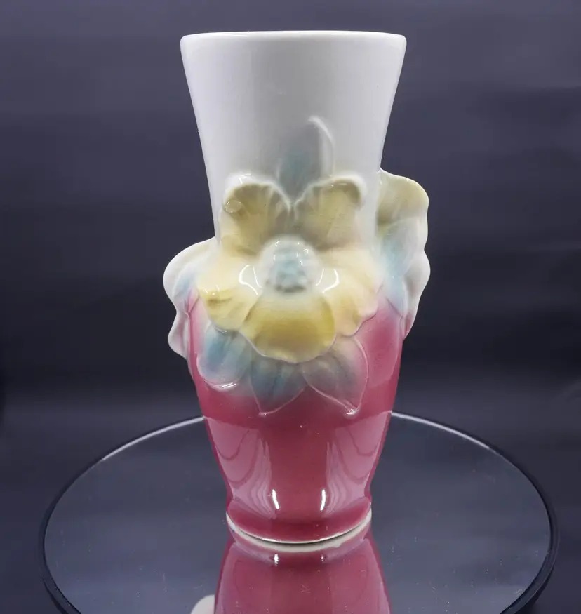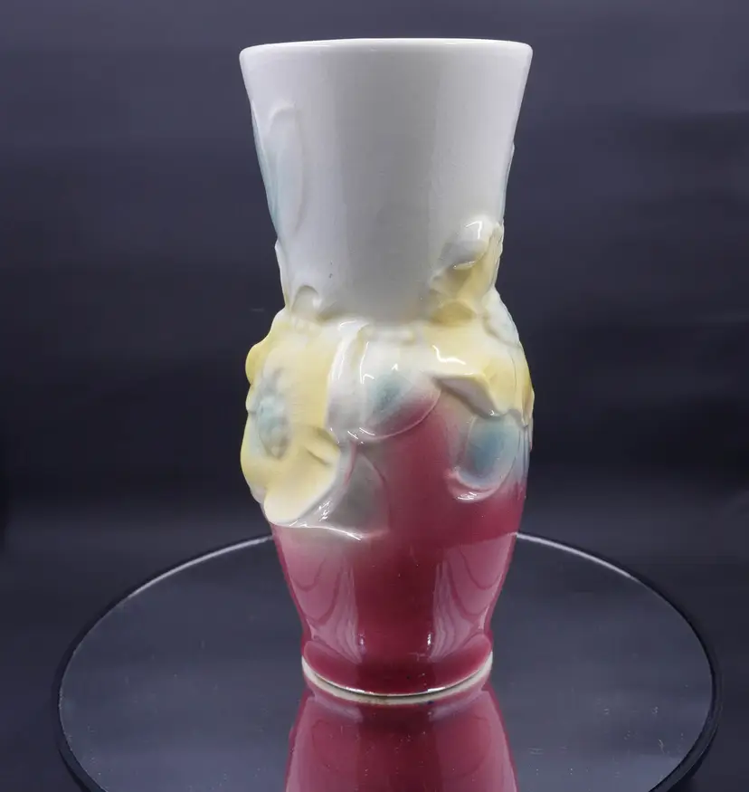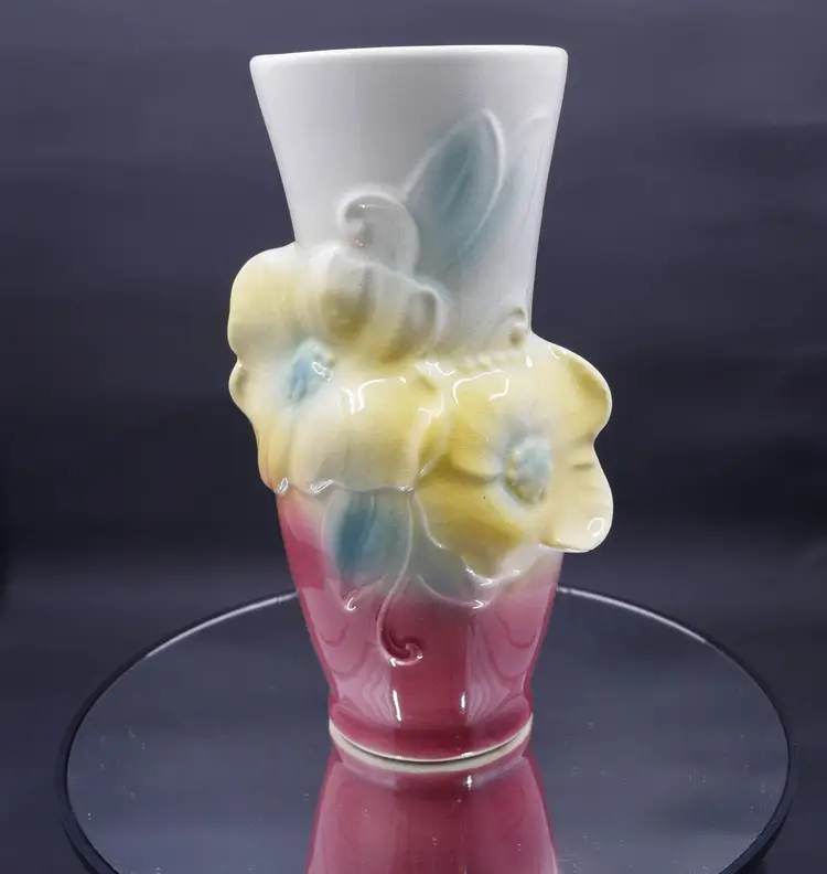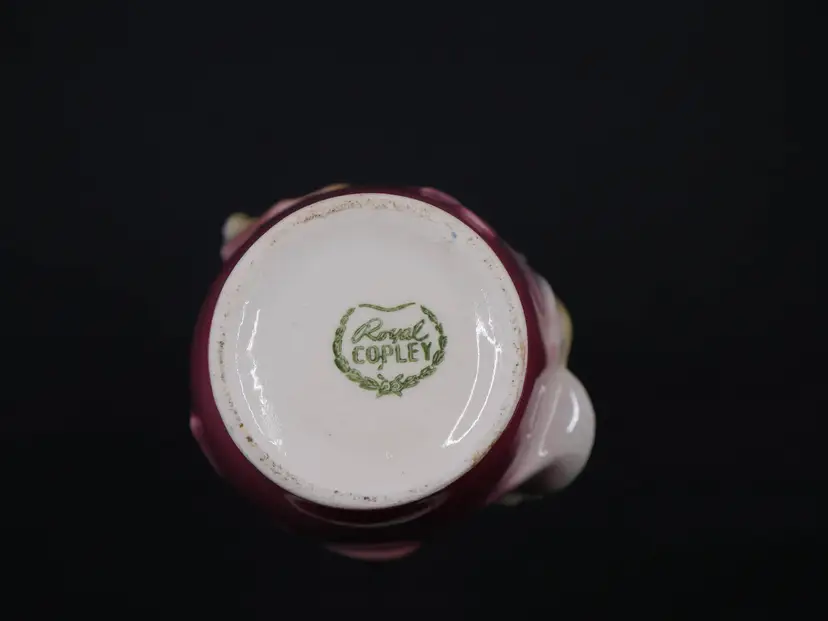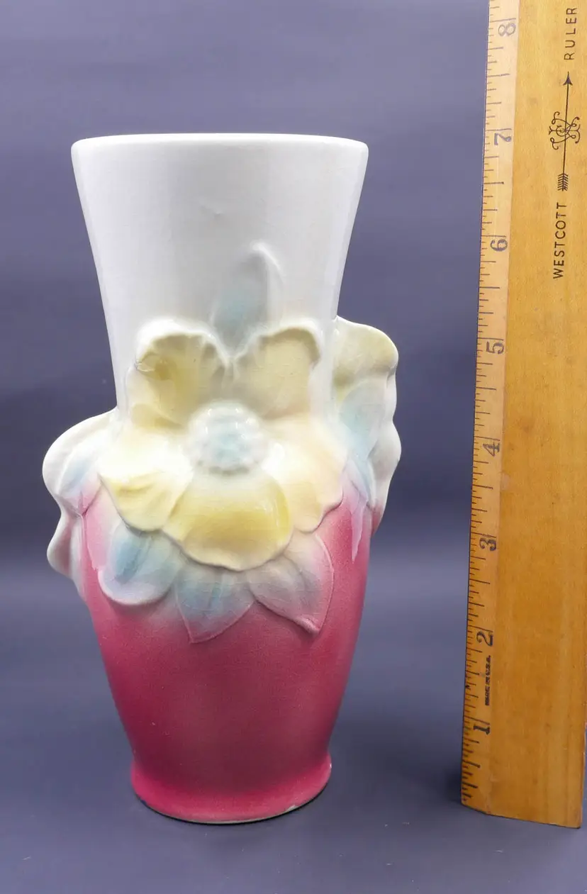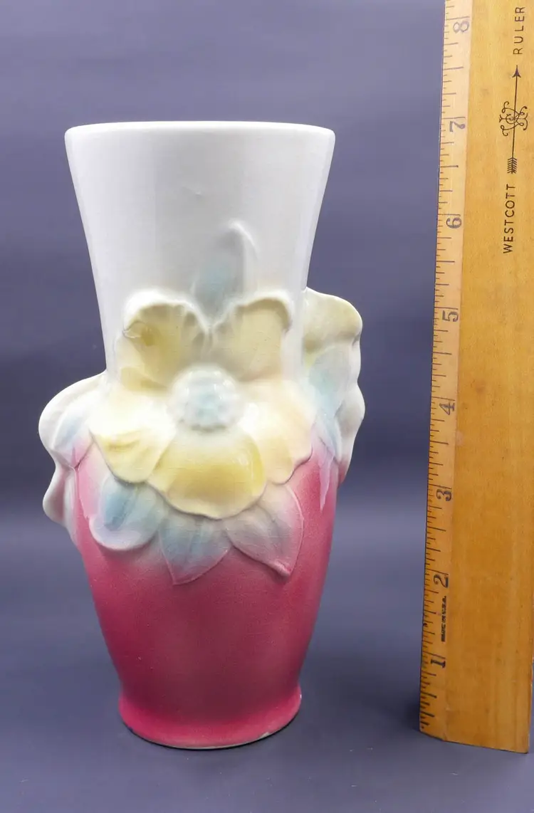 A tall, flared vase made of glazed ceramic with an art deco-inspired shape. The vase features a hand-painted floral design with two prominent yellow flowers and blue leaves. The top half is a creamy white, while the bottom fades into a rich, pink/maroon color. It shows uniform crazing throughout, a sign of age, but has no chips or cracks. The base is marked with the "Royal Copley" stamp inside a floral wreath. The vase stands approximately 7 inches tall.