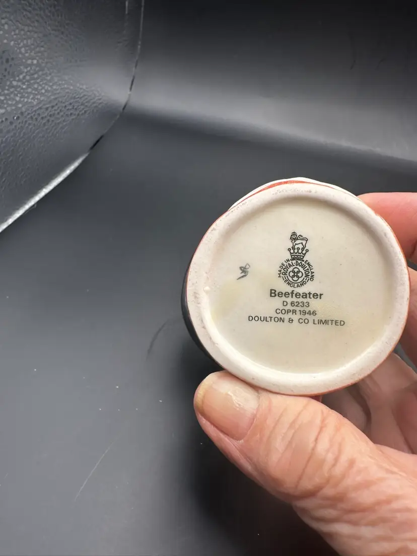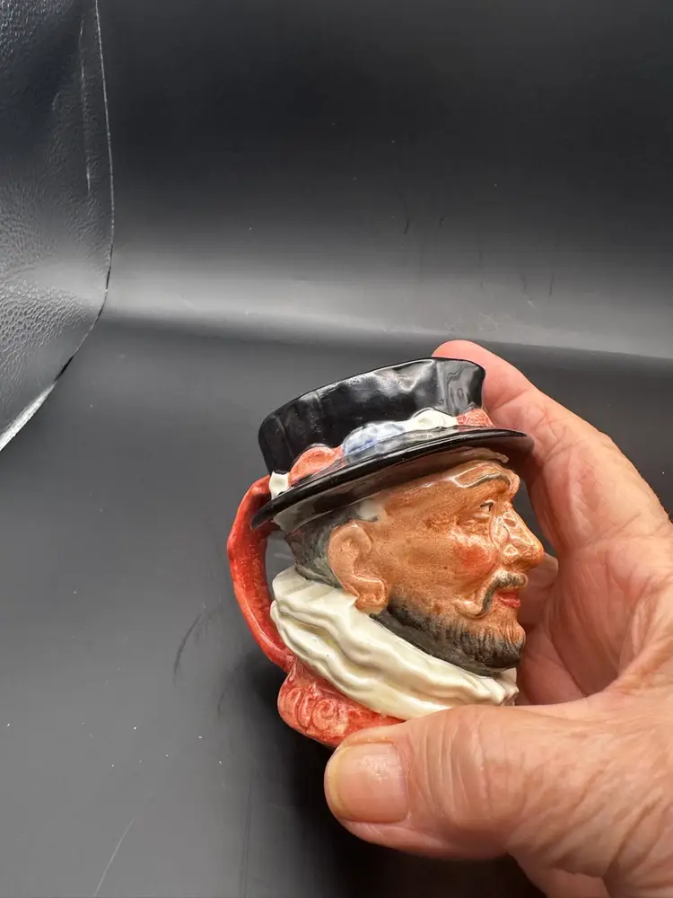 A 3 1/2 inch Royal Doulton Beefeater character jug, model D6206. The design depicts a Yeoman Warder, the ceremonial guardians of the Tower of London, colloquially known as "Beefeaters" No chips or cracks