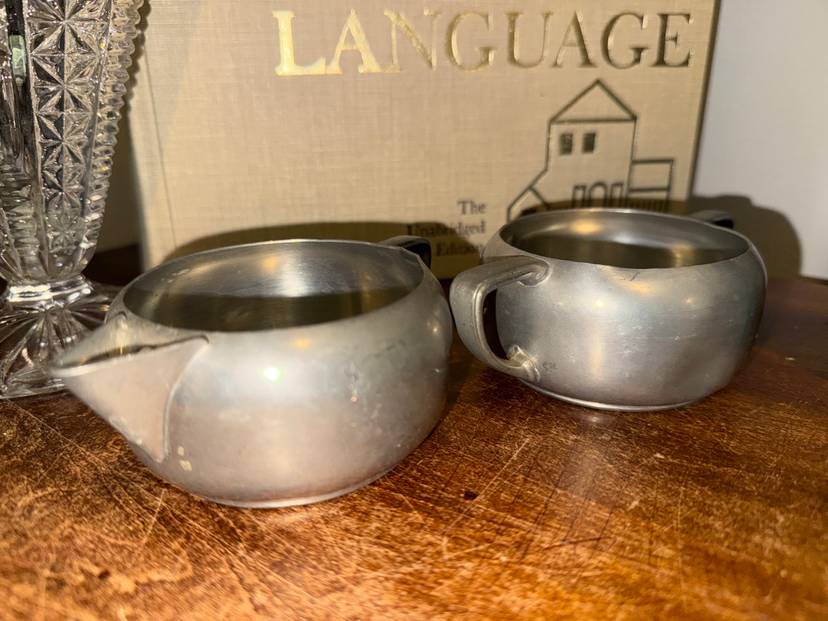 Vintage Royal Holland KMD Tiel Pewter Creamer and Sugar Bowl Set. This classic pre-owned set includes a creamer and a matching sugar bowl, crafted from high-quality pewter. Each piece showcases the elegant design typical of Royal Holland KMD Tiel, reflecting vintage European craftsmanship. Perfect for collectors or adding a touch of antique charm to your tea or coffee service. Excellent pre-owned condition with a lovely aged patina. No significant dents or damage, just the natural wear expected from a vintage item.