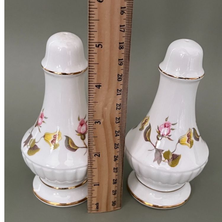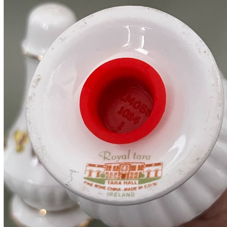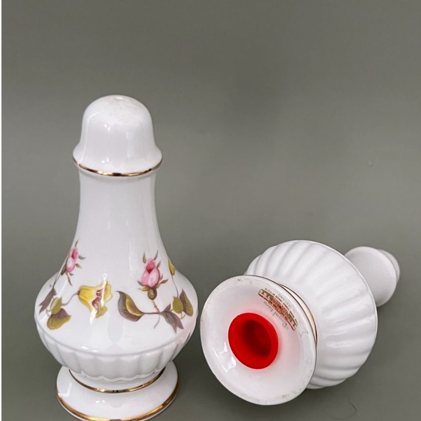 A pair of fine bone china Royal Tara shakers made in a Galway,Ireland in the 1960’s. Lovely rosebud motif with gold trim. One is missing the stopper.