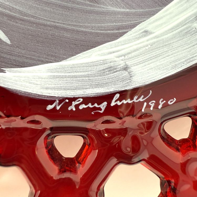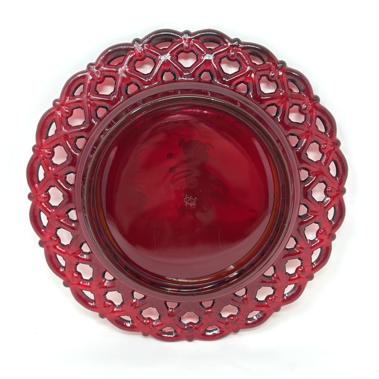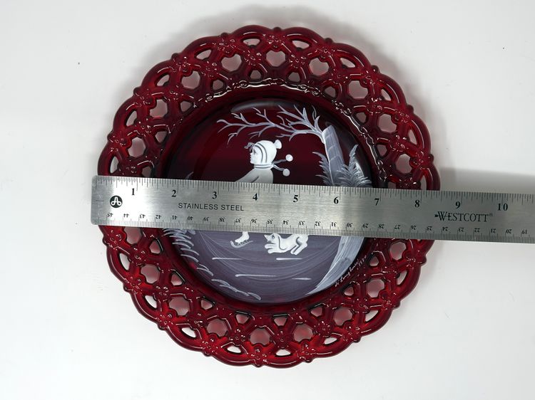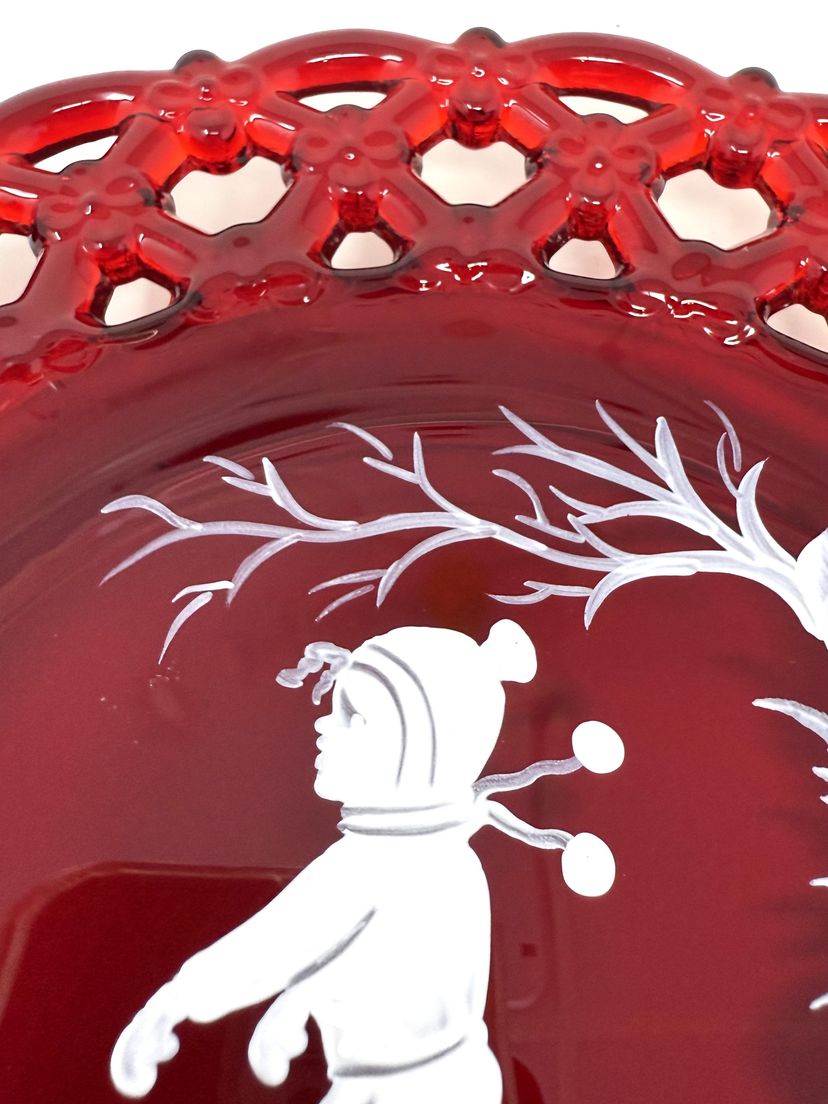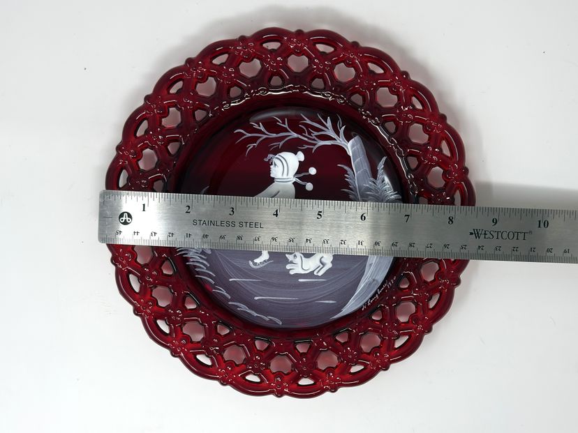 Key Features: - Authentic Westmoreland Glass Co. with “WG” mark on base and artist’s signature “N. Larry Hull 1980” - Shimmering ruby red pressed glass with delicate hand-painted white enamel details - Reticulated (open lace) rim adds traditional elegance - Unique winter scene captures nostalgia and warmth - Measurements: Diameter: 8.75", Height: 1", Weight: 1 lb 4 oz