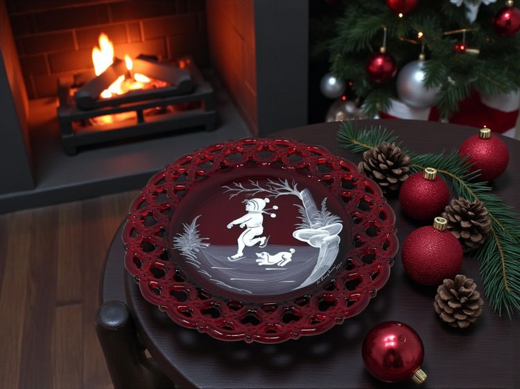 Bring a touch of timeless holiday charm to your home with this signed 1980 Westmoreland Glass Christmas plate, beautifully hand-painted by artist N. Larry Hull. Crafted in deep ruby red pressed glass, this collectible plate features an ornate open lace rim and a playful winter scene of a boy ice skating with his loyal dog—making it a standout piece for any vintage display or family tradition.