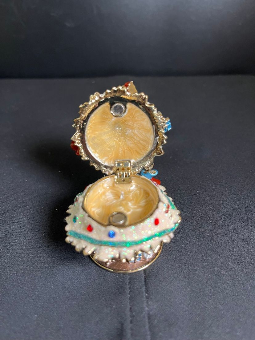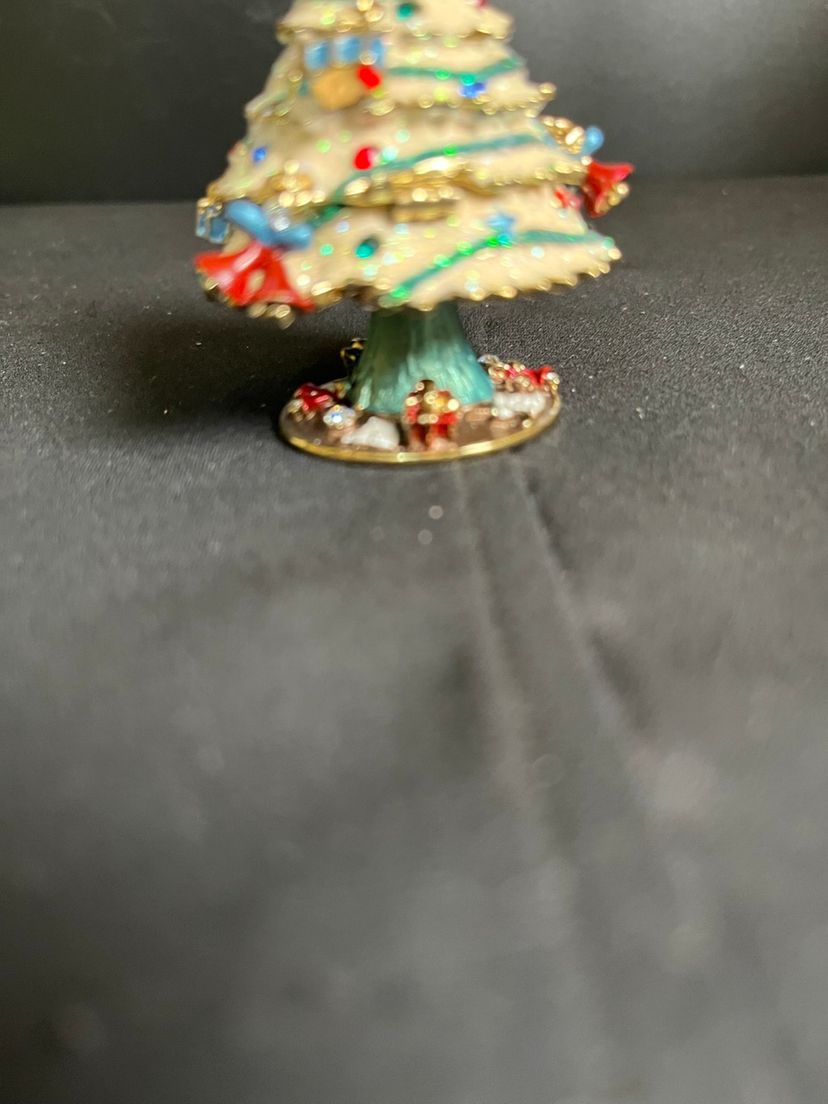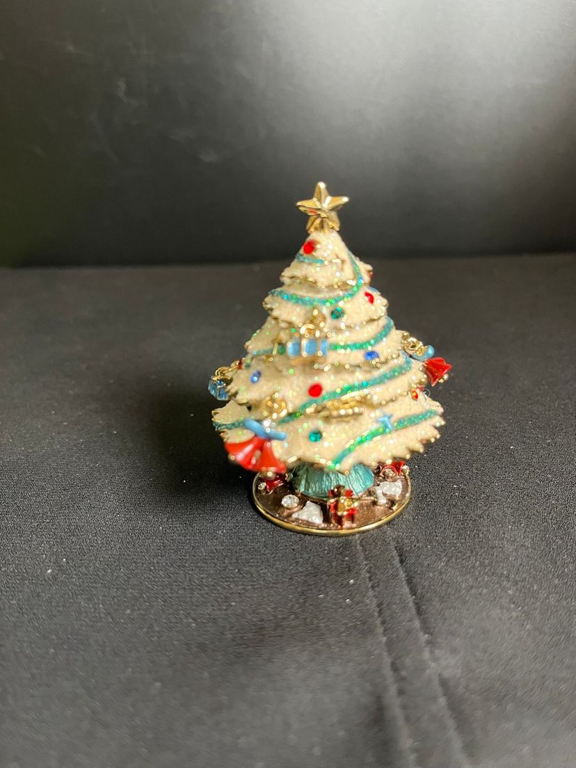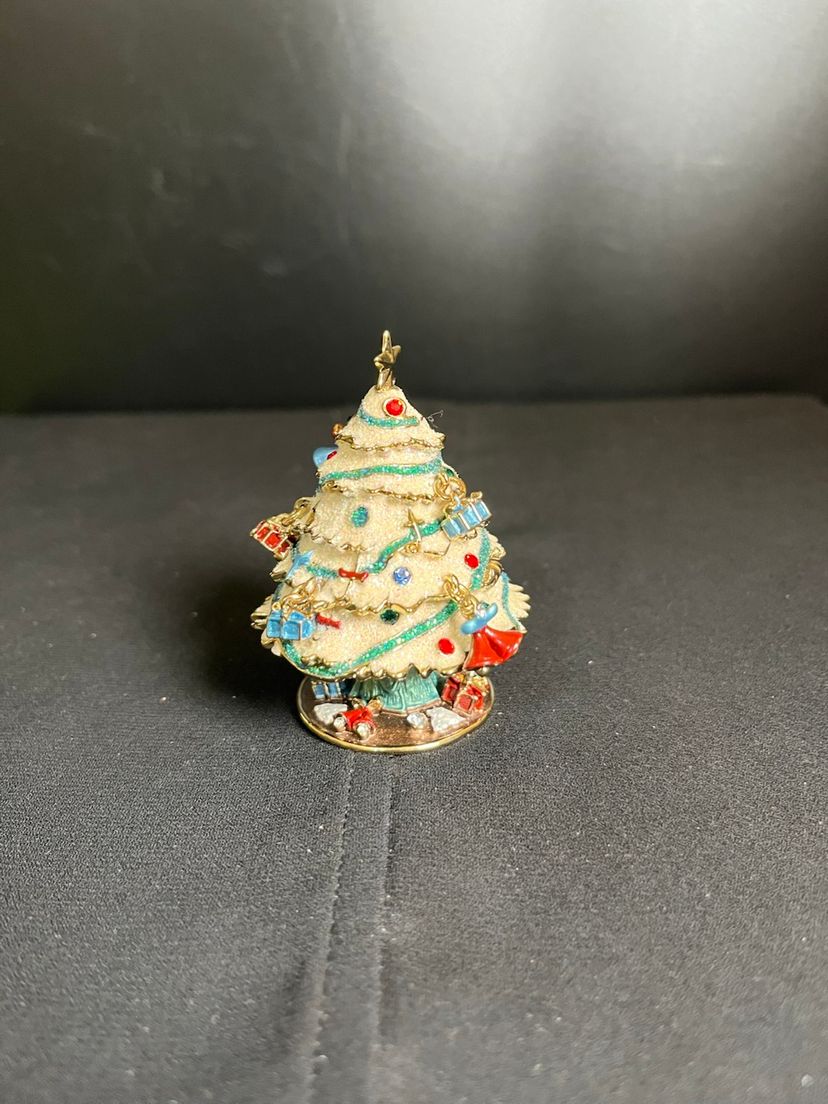 This is beautiful. Features random ornaments hanging from the tree. Beautifully finished inside with enamel paint. There is nothing wrong with this beauty, it is in great pre loved vintage condition. It measures approx 2.75"H, 2" at widest point, 4.6 Oz.