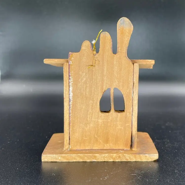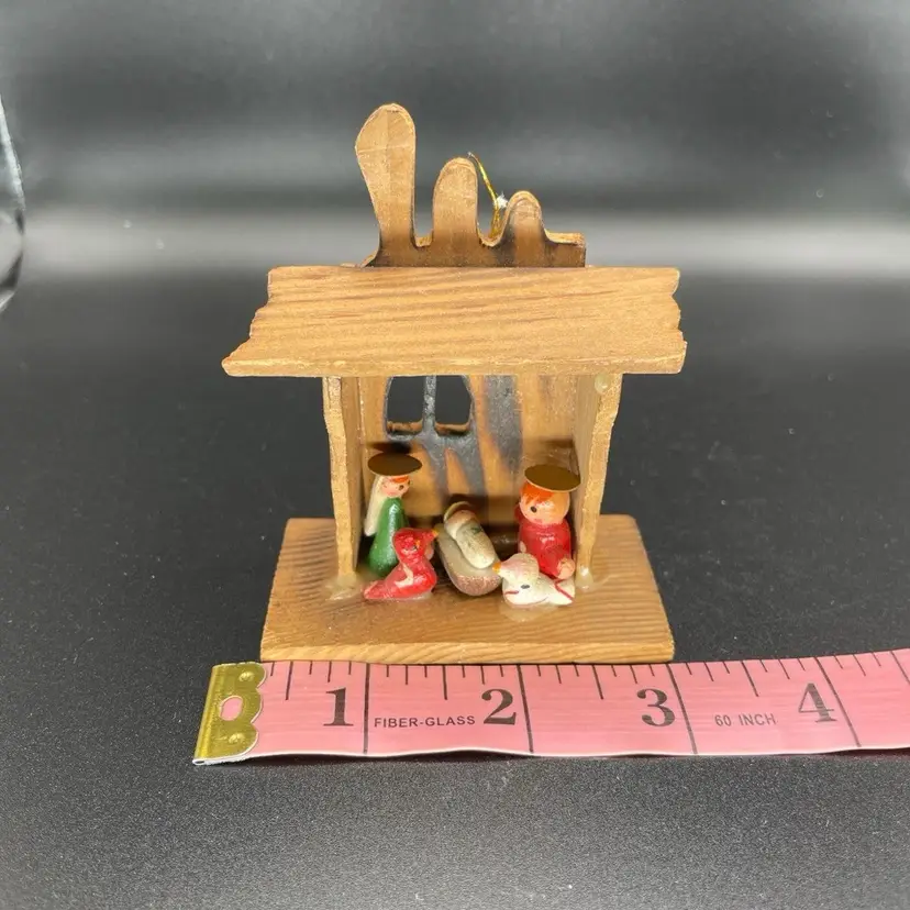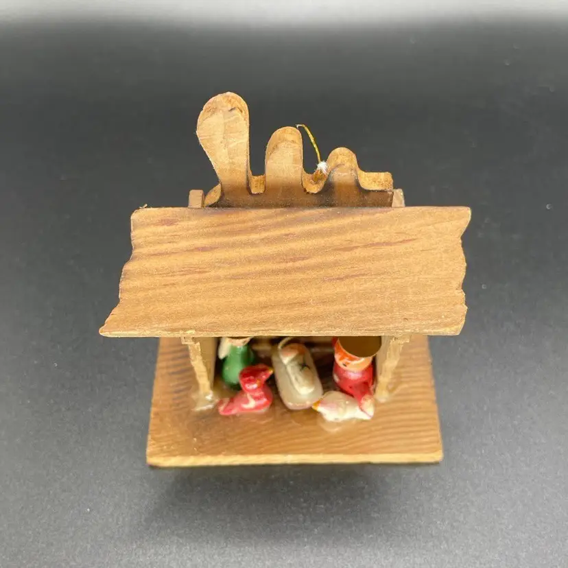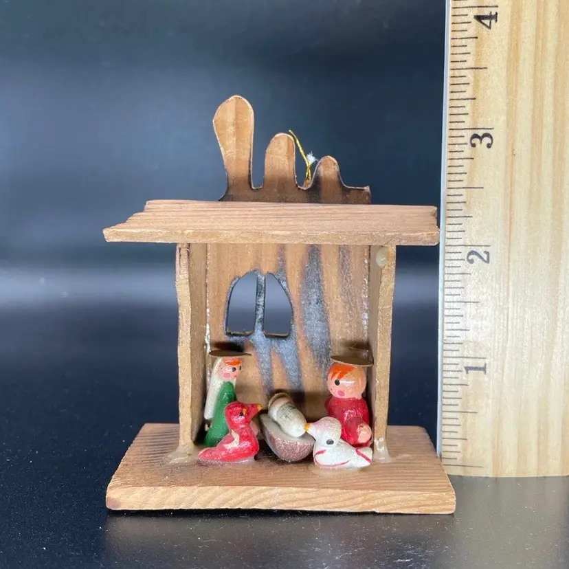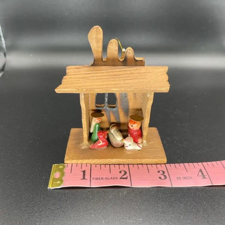 This is a vintage Russ miniature wooden Nativity scene ornament with original label. It is missing its string. Measures approximately 3.5" tall x 3" long x 2" wide. No chips or cracks