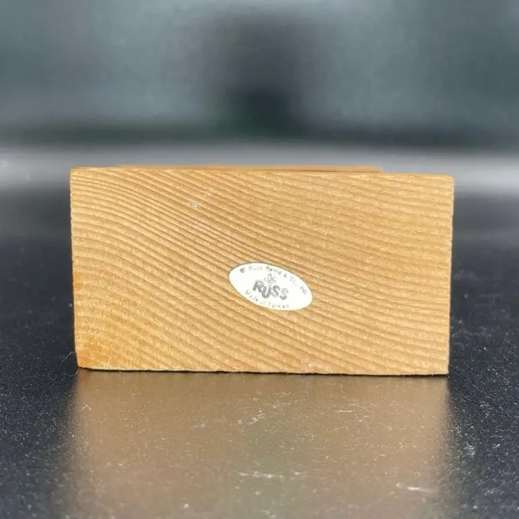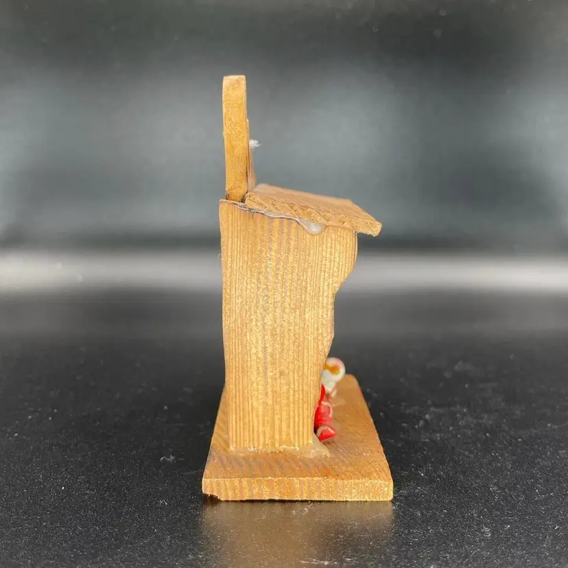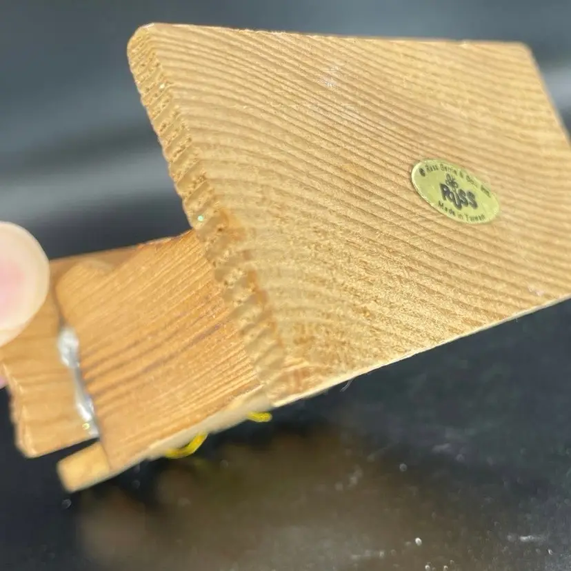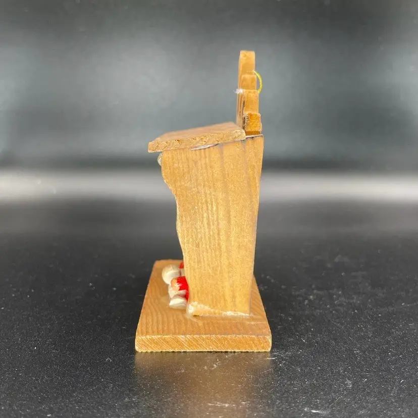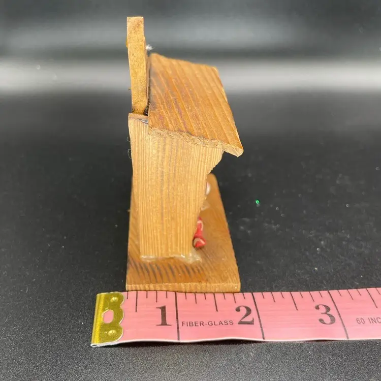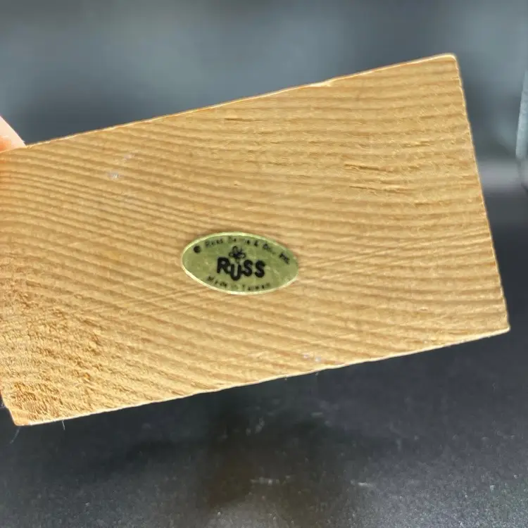 This is a vintage Russ miniature wooden Nativity scene ornament with original label. It is missing its string. Measures approximately 3.5" tall x 3" long x 2" wide. No chips or cracks
