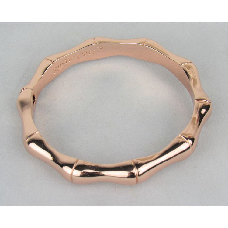 Rose Gold tone bracelet with magnetic closure. Missing the safety latch but the magnets are super strong and it is not coming open easily. Signed Rustic Cuff. Beautiful bamboo styling. Weighs 57.62 grams.