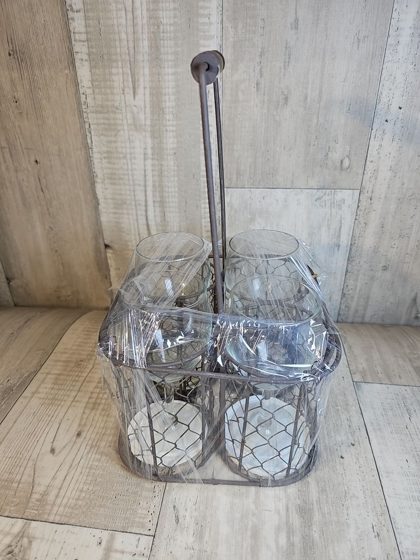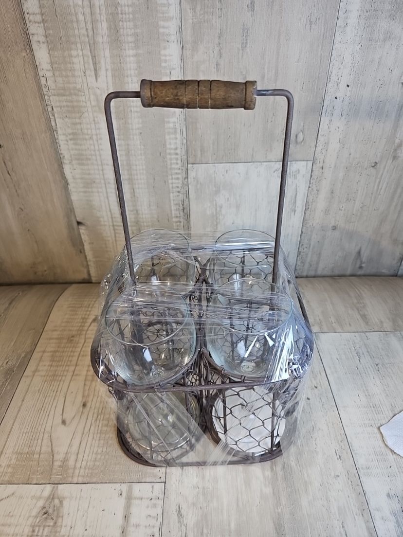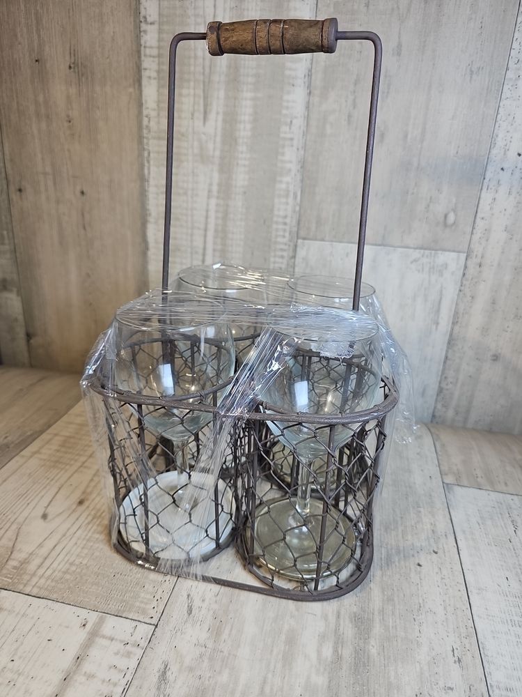 A beautifully made farmhouse-style wire caddy that holds up to six glasses, perfect for picnics, wine tastings, or kitchen decor. Wrapped and unused, this piece blends function with rustic charm — durable, versatile, and ready for display or entertaining.