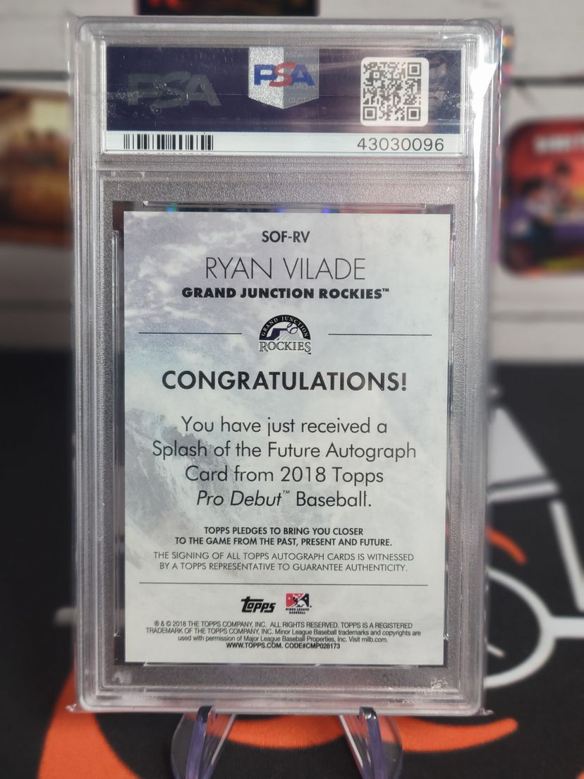 Ryan Vilade 2018 Topps Pro Debut “Splash of the Future” Orange Refractor Autograph, serial numbered /25, graded PSA 10 GEM MINT. A scarce early-issue insert auto from Topps’ premier MiLB product, offering low print rarity with top-tier grading for long-term value. Perfect for prospect collectors, Rockies fans, or PSA registry investors looking for a true limited run card.