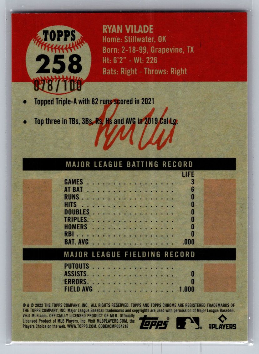This is a rare and highly collectible Ryan Vilade 2022 Topps Chrome Platinum Anniversary Rookie Card (RC) parallel!