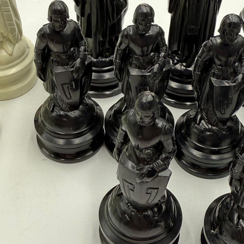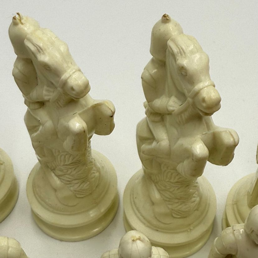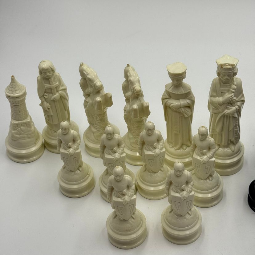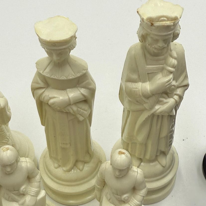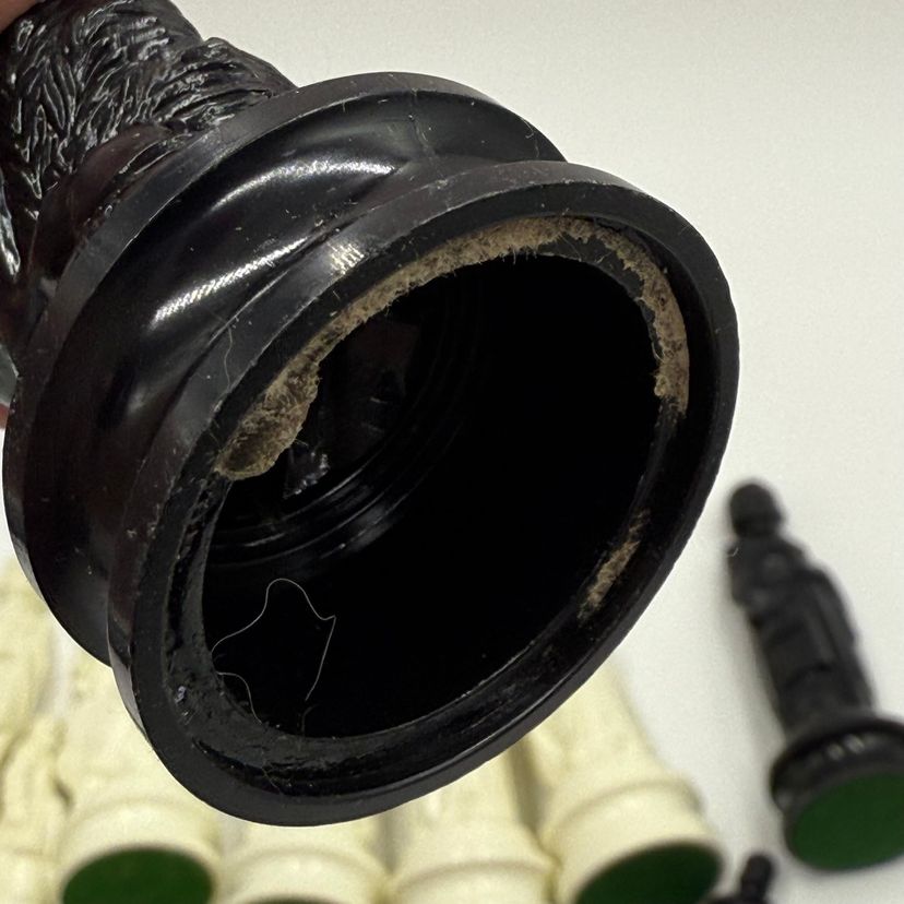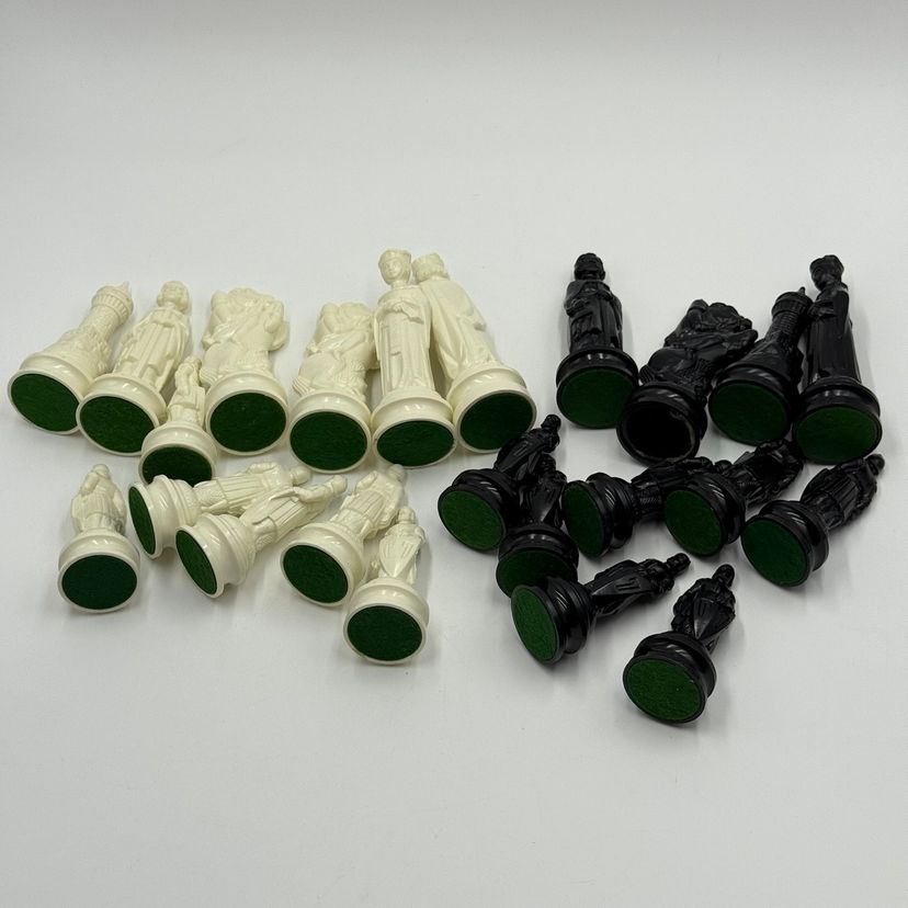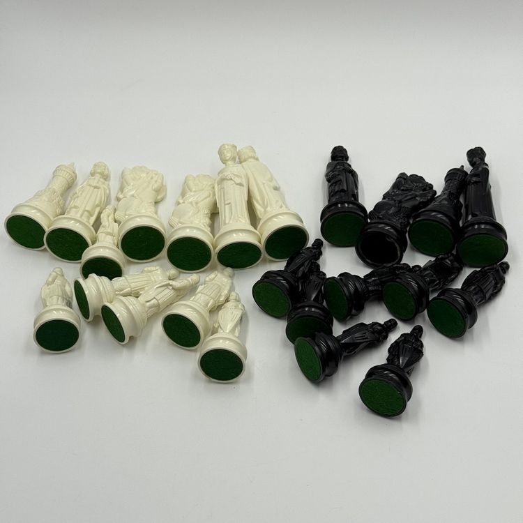 Incomplete set of 23 pieces In good condition. The white king has a little bit of a stain on the crown. The black knight is missing the felt bottom.