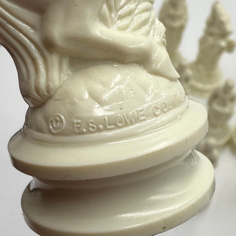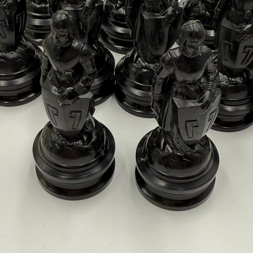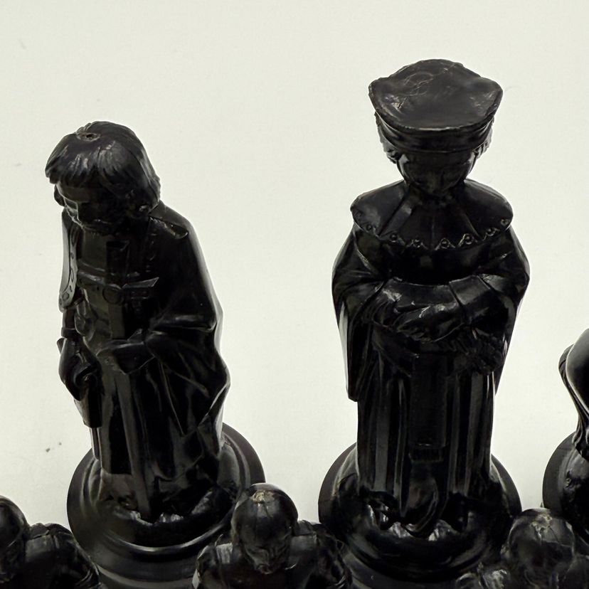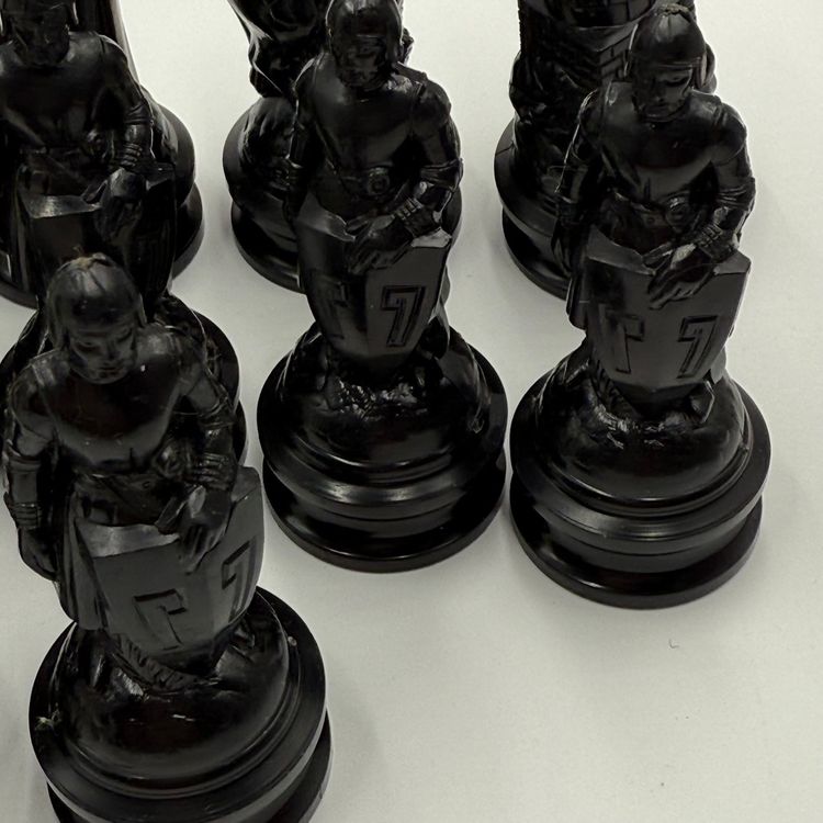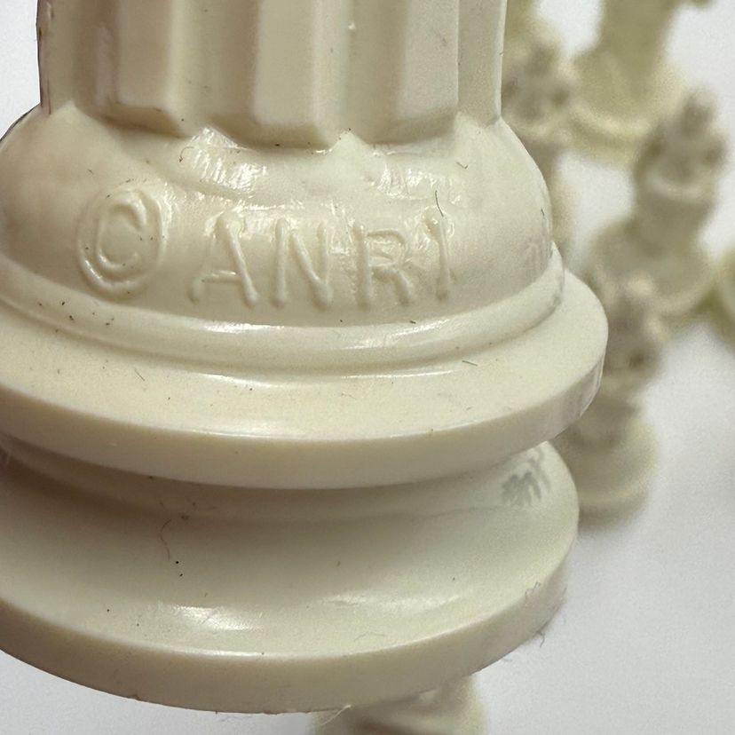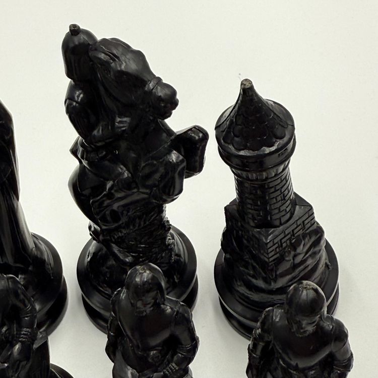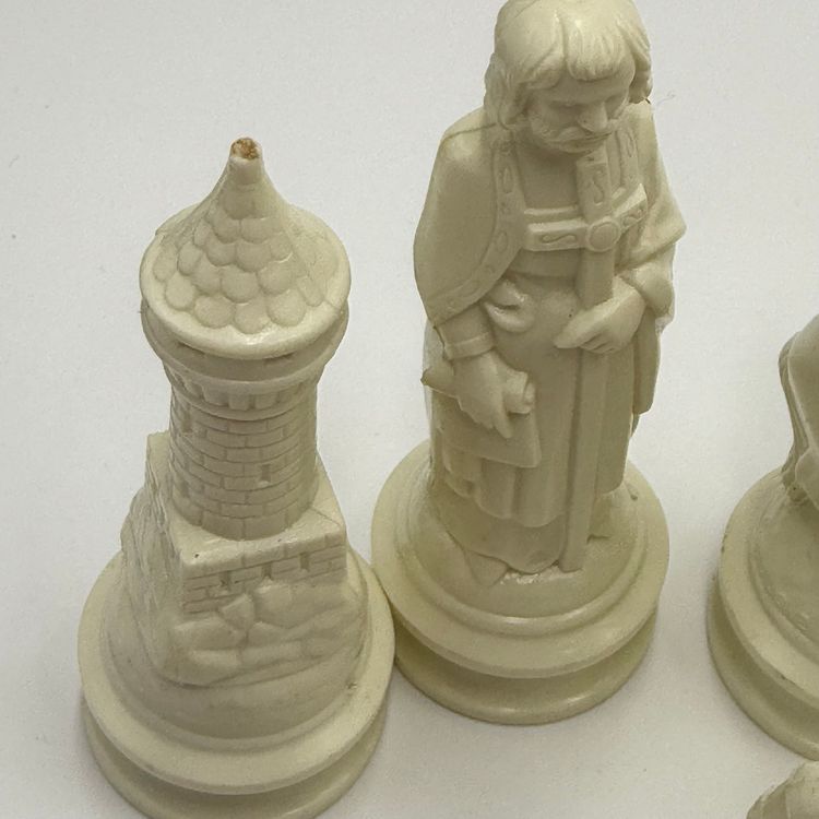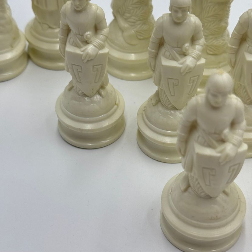 Incomplete set of 23 pieces In good condition. The white king has a little bit of a stain on the crown. The black knight is missing the felt bottom.
