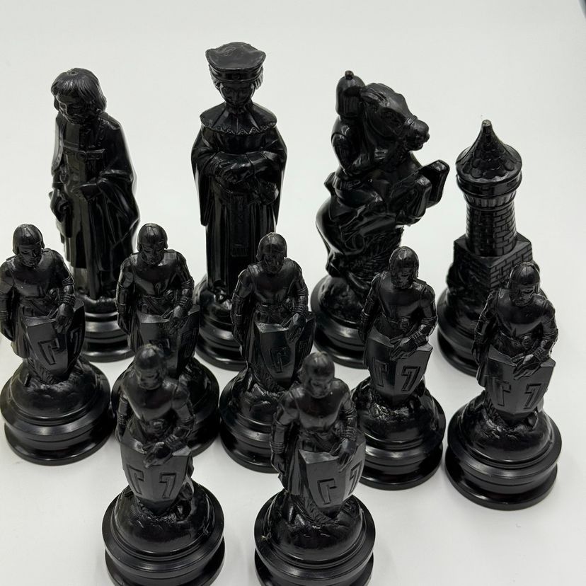 The black set consists of: 7 pawns 1 knight 1 rook 1 Queen 1 bishop.