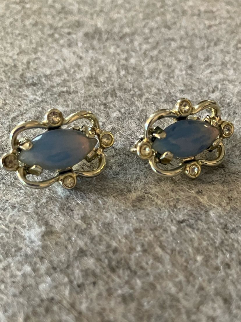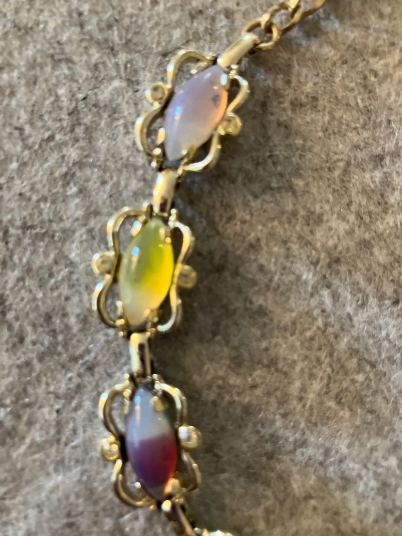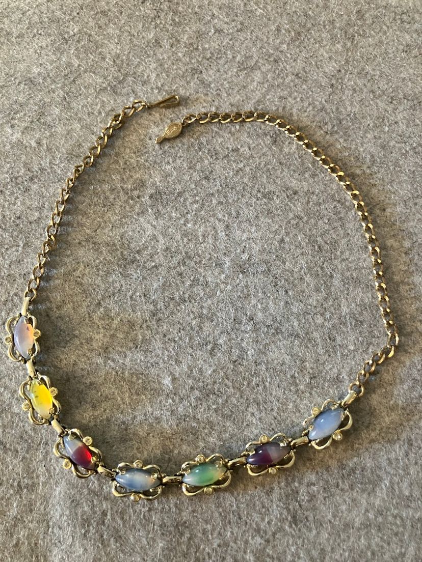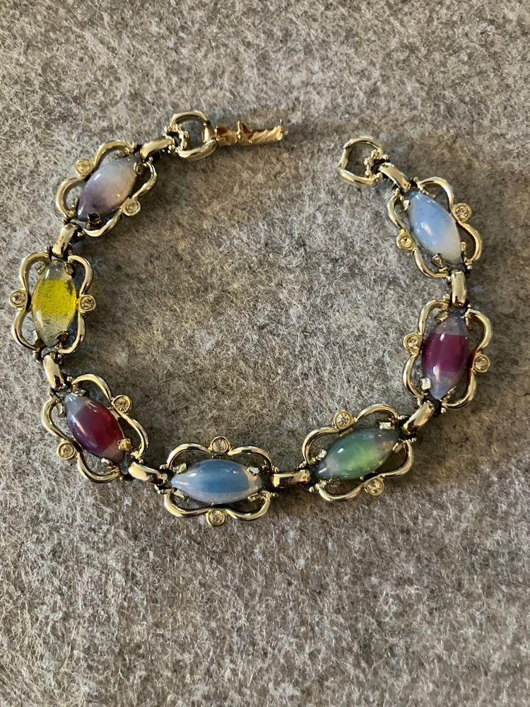 Sabrina Fair marked Sarah Coventry. Vintage 1959/1960. Set includes necklace, bracelet & clip on earrings. Multicolored insets. Measurements - Necklace - 18” L X 1/2” W Bracelet - 7 1/4” L X 1/2” W has fold over closure. Clip on earrings - 7/8” L X 1/2” W have a blue moonstone look insets. Set - Preowned in Excellent Condition.