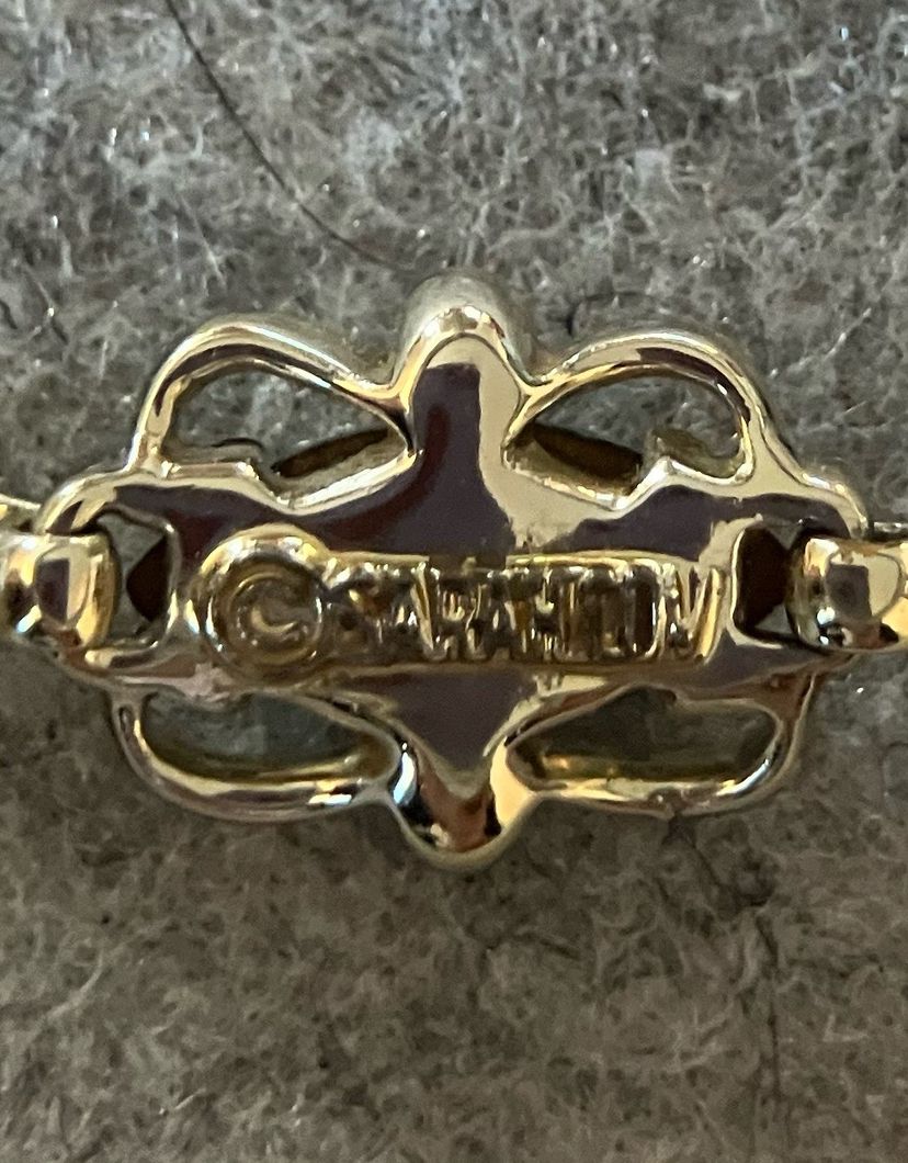 Sabrina Fair marked Sarah Coventry. Vintage 1959/1960. Set includes necklace, bracelet & clip on earrings. Multicolored insets. Measurements - Necklace - 18” L X 1/2” W Bracelet - 7 1/4” L X 1/2” W has fold over closure. Clip on earrings - 7/8” L X 1/2” W have a blue moonstone look insets. Set - Preowned in Excellent Condition.