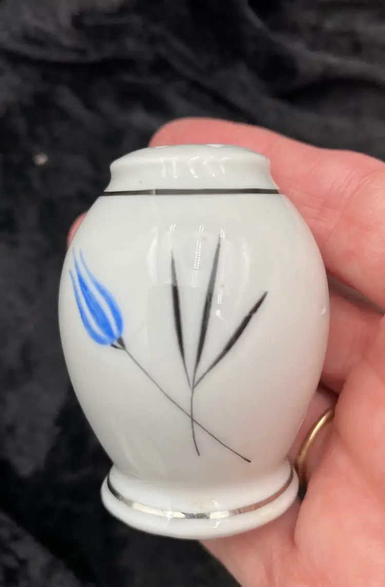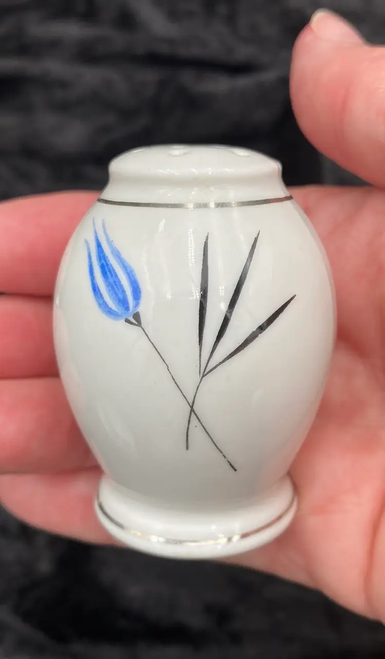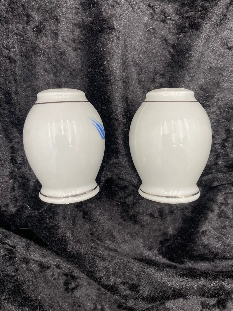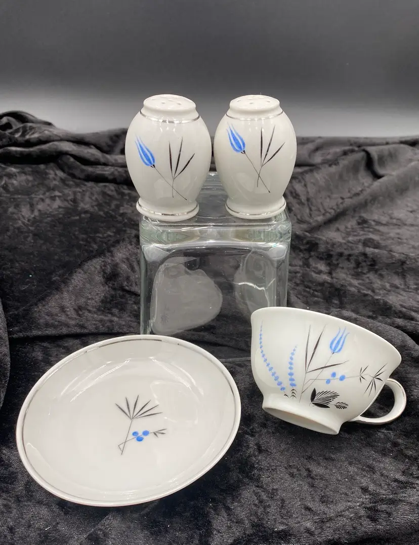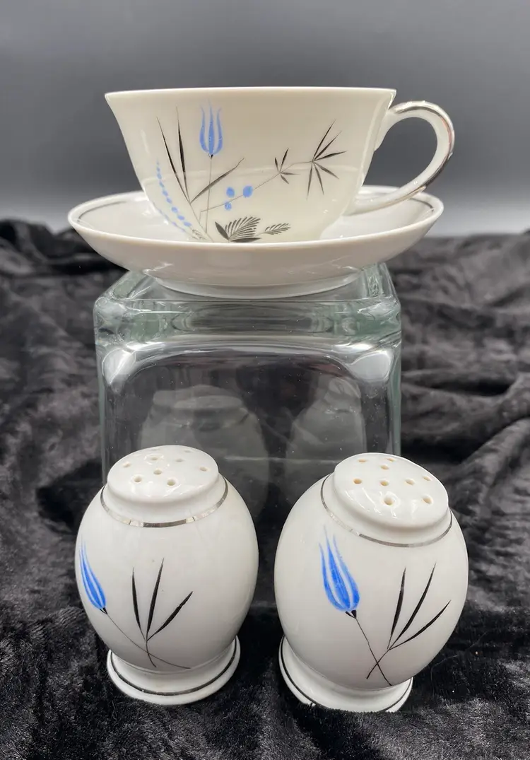 Spice up your dining table with this elegant, petite set of Salt & Pepper Shakers, plate and cup. Made from fine china, the design is Mid-Century Modern, with a beautiful blue and black design with silver piping. The set is made in Bavaria, Germany, and features the brand Home Arts, Arlington pattern (discontinued pattern). Each shaker is 2.25 inches tall and has the original stopper. The plate is 4 inches. The cup is 1.5 inches tall and 3 inches wide, with the handle adding .75 inches.