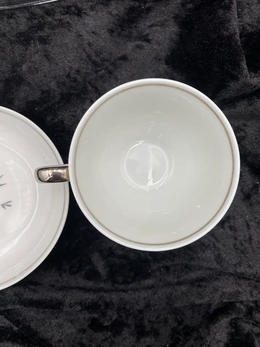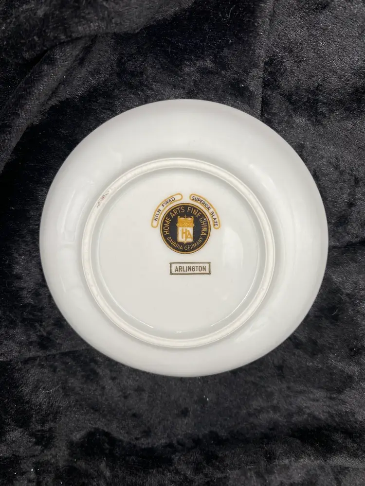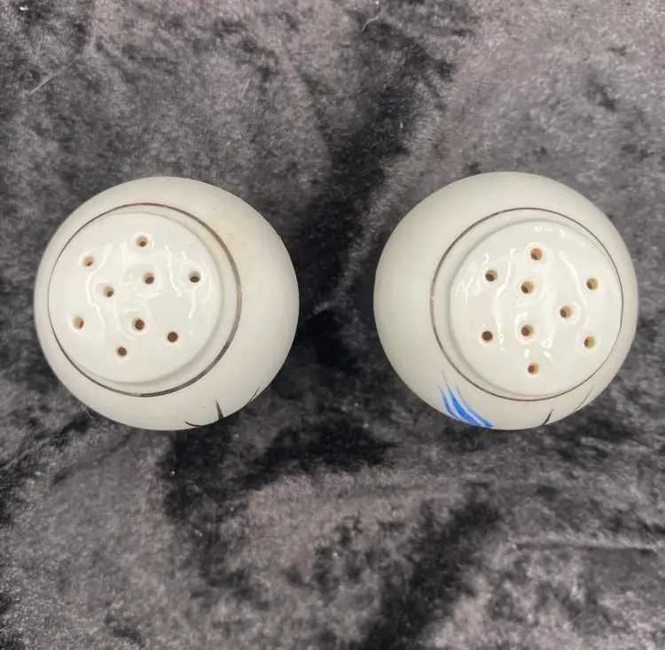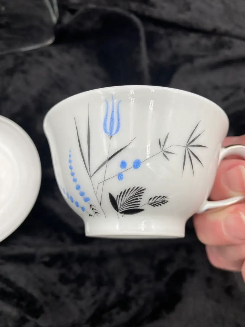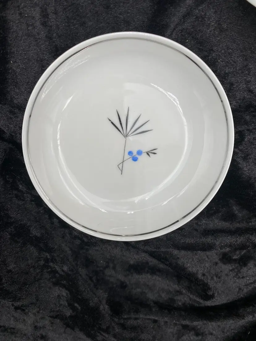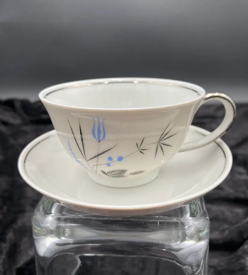 Spice up your dining table with this elegant, petite set of Salt & Pepper Shakers, plate and cup. Made from fine china, the design is Mid-Century Modern, with a beautiful blue and black design with silver piping. The set is made in Bavaria, Germany, and features the brand Home Arts, Arlington pattern (discontinued pattern). Each shaker is 2.25 inches tall and has the original stopper. The plate is 4 inches. The cup is 1.5 inches tall and 3 inches wide, with the handle adding .75 inches.