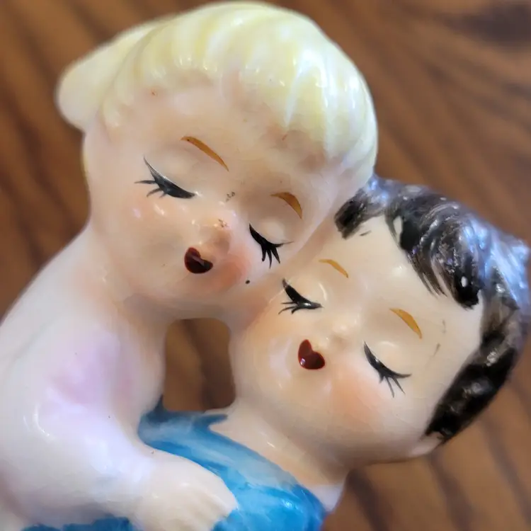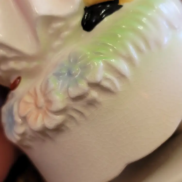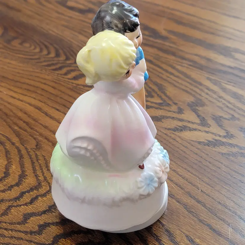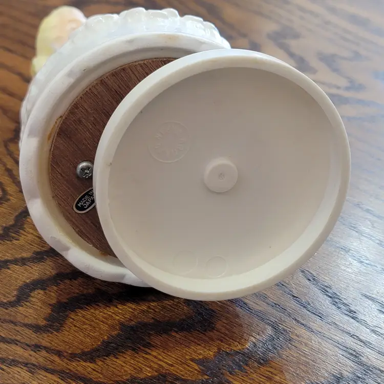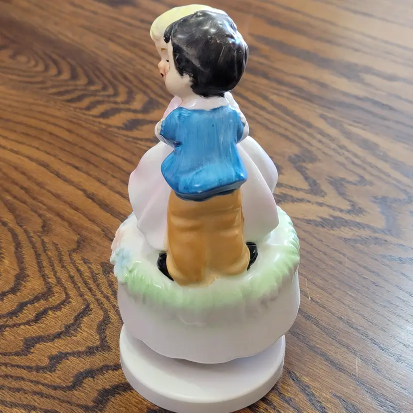 Plays music and spins. Made in Japan. No chips or cracks. Crazing throughout. Small discoloration marks on faces. Adorable vintage piece. 7"-H