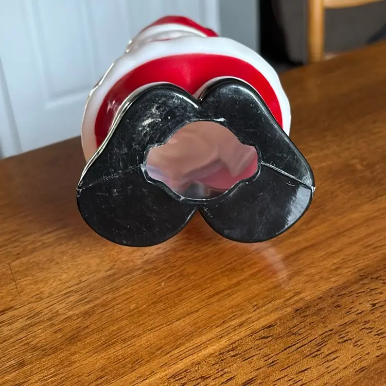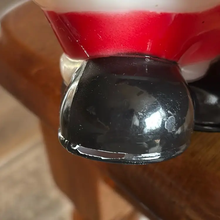 Vintage 1960’s hard plastic blow mold Santa. Amal sliver on boot where plastic is missing. Stands 9” tall.
