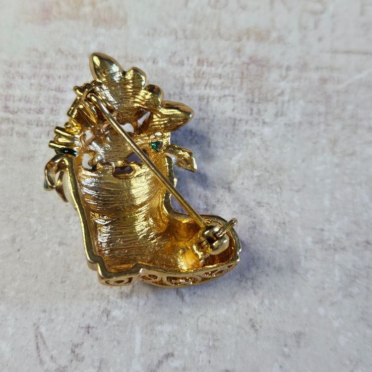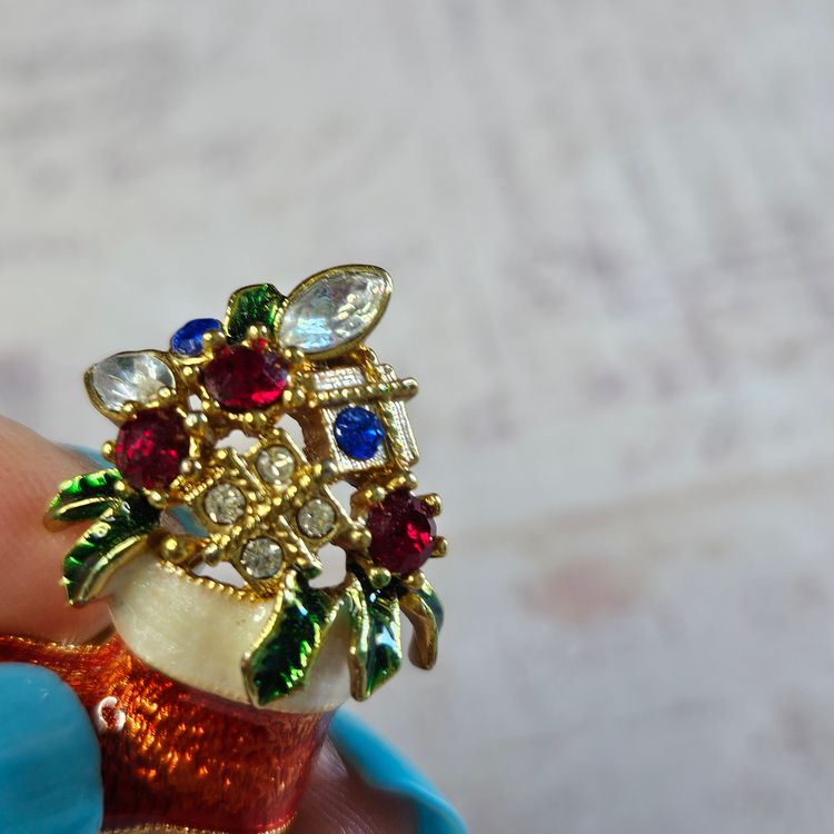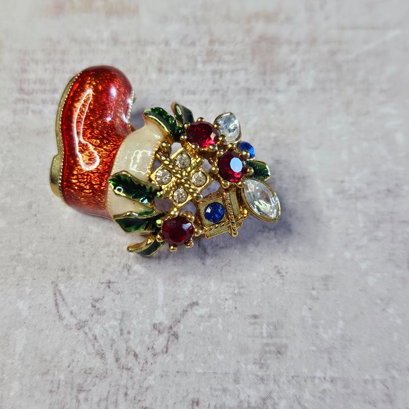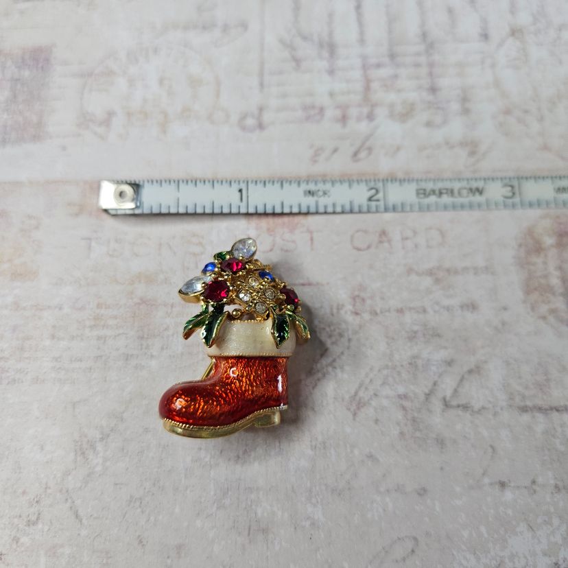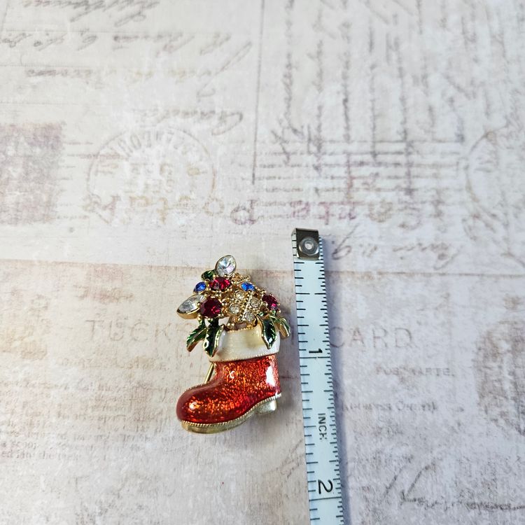 Unmarked. Boot full of holly leaves and sparkly presents. Sweet size of 1"!