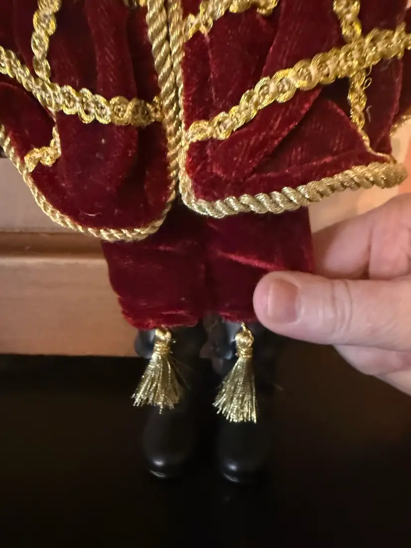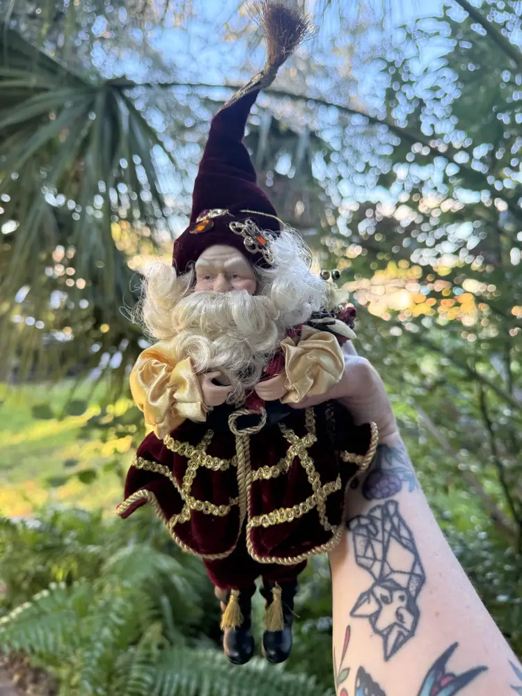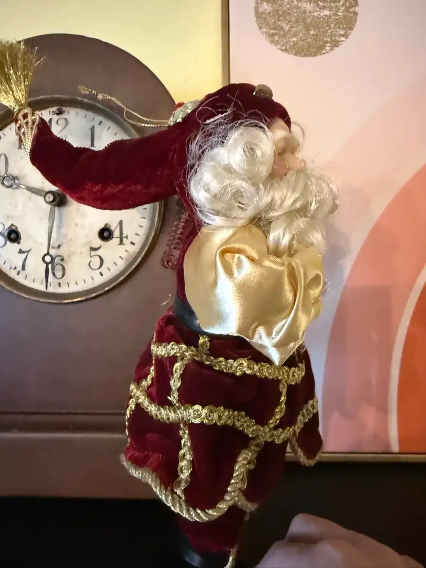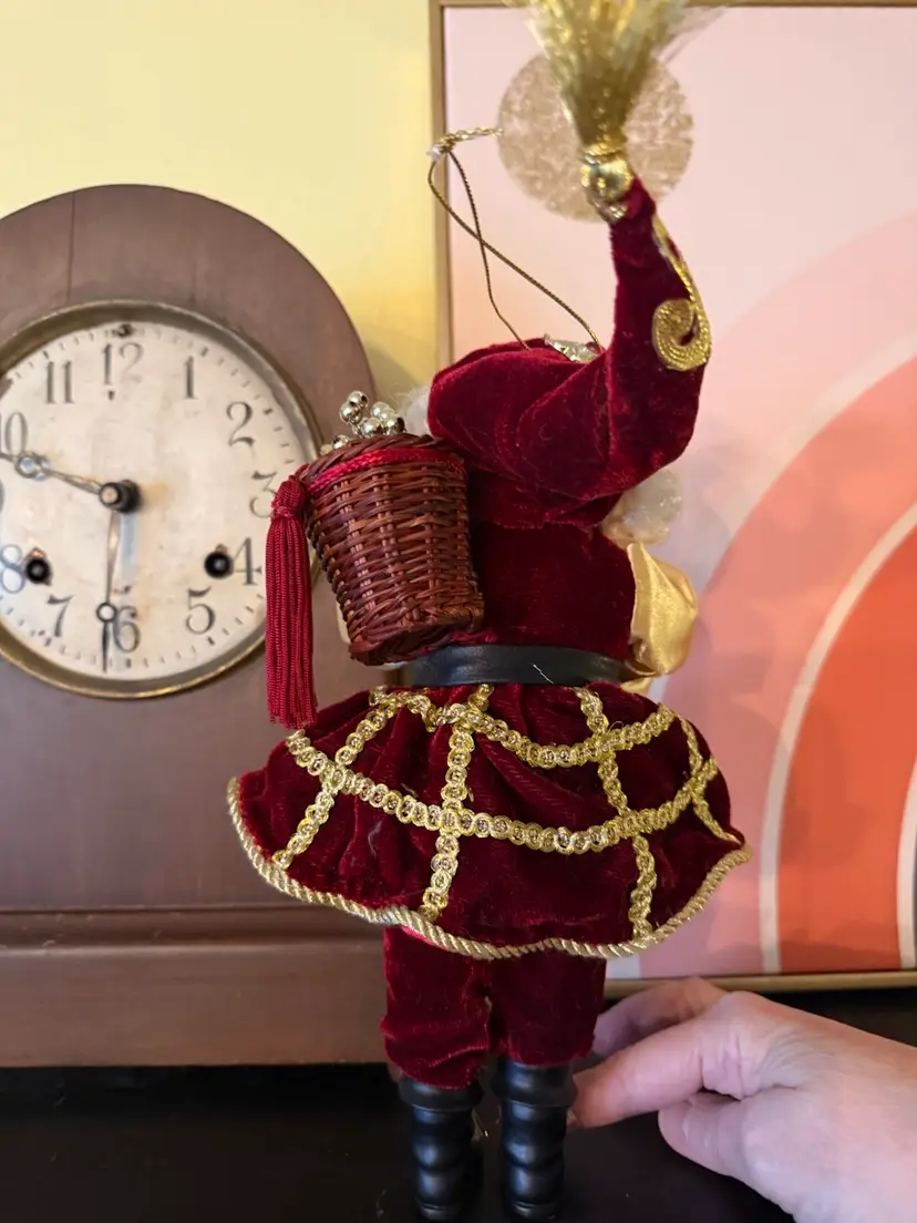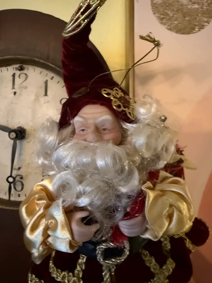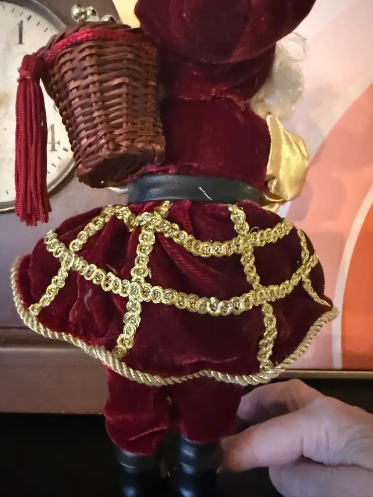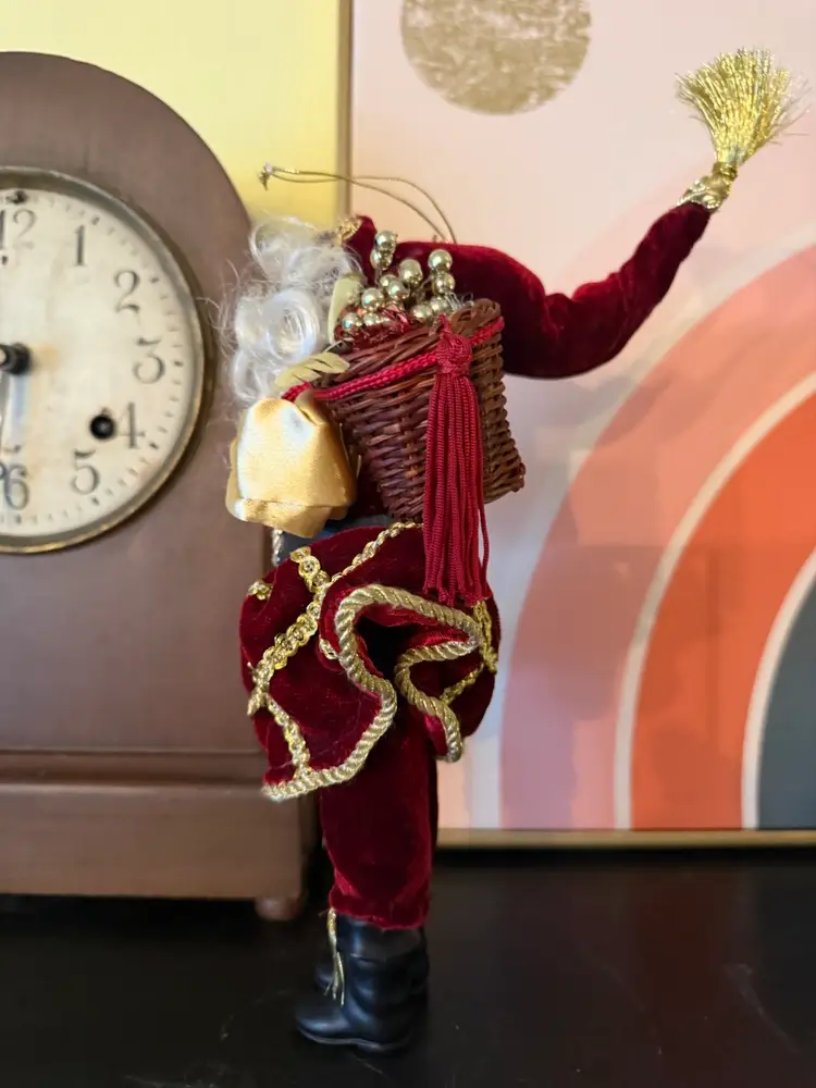 Bring a touch of opulent Old World charm to your holiday décor with this richly detailed Santa Claus figurine. Dressed in deep burgundy velvet trimmed in gold braid and satin sleeves, this regal Father Christmas carries a wicker basket filled with shimmering ornaments and wears a tall jeweled hat topped with a gold tinsel burst. His expressive resin face and hand-sculpted beard add lifelike warmth. Perfect as a centerpiece, mantle accent, or elegant hanging ornament.
