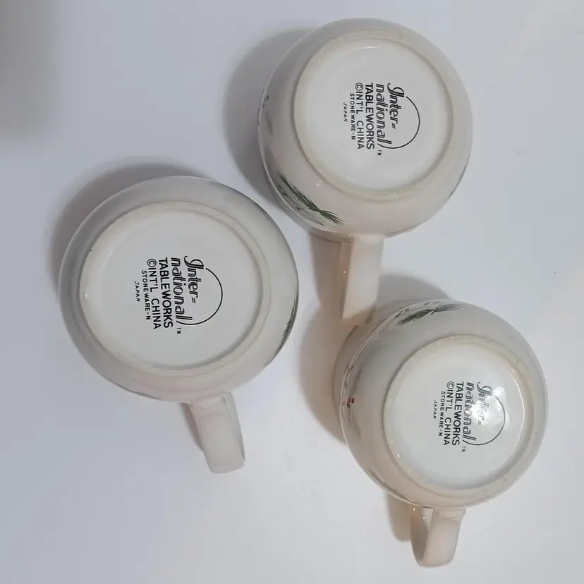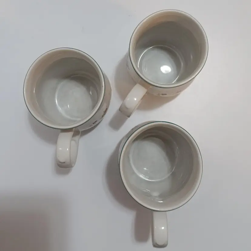 Santa's Sleigh Pulled By Farm Animals Adorns This Set Of 3 Ceramic Mugs; International Table Works; 4" T x 5" W; Good Condition with some wear; no chips or cracks or crazing