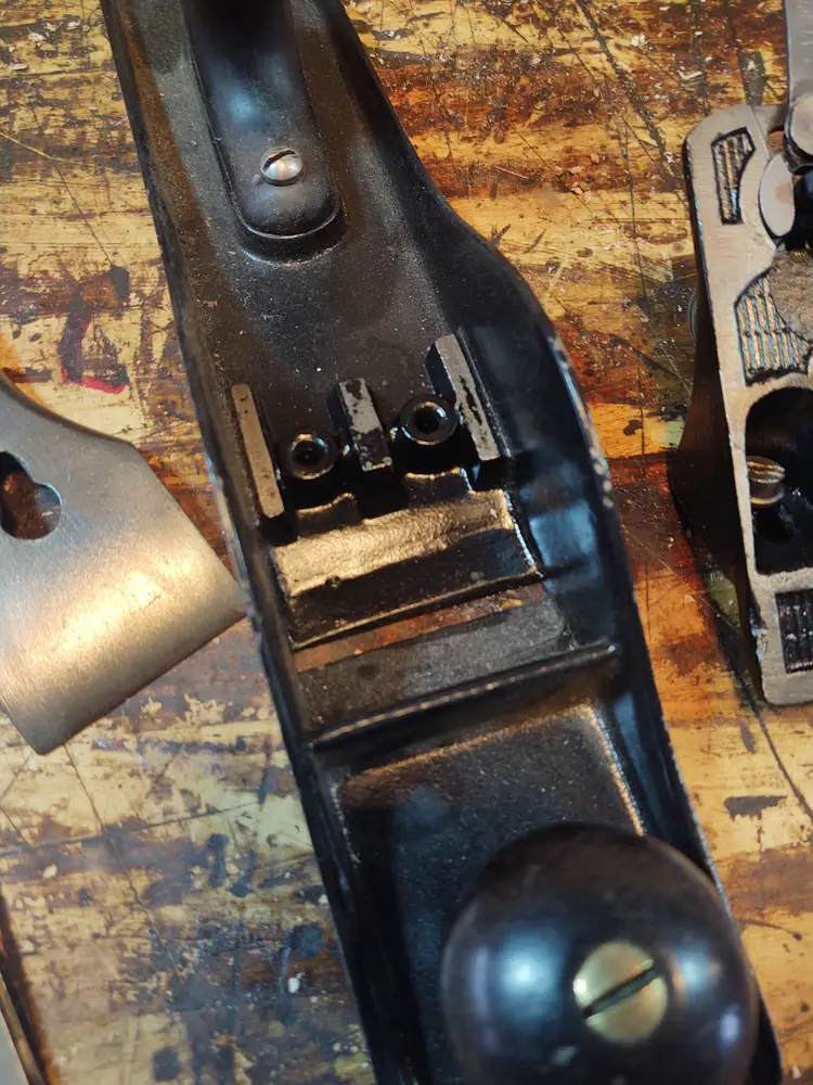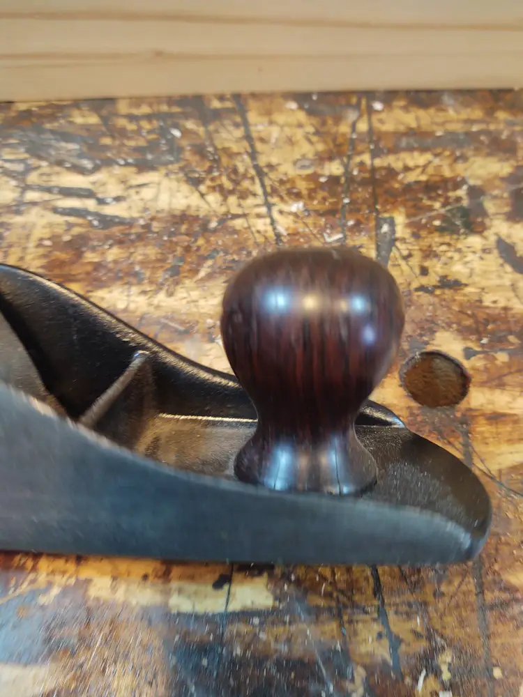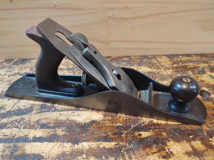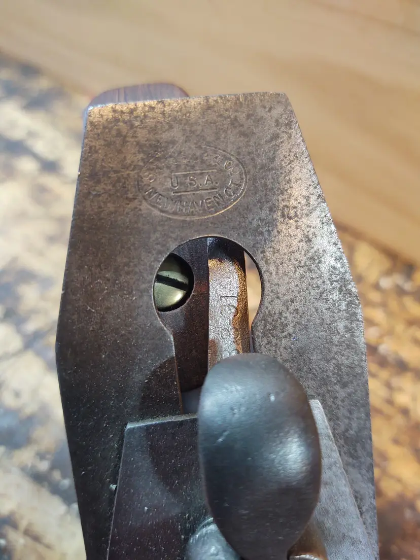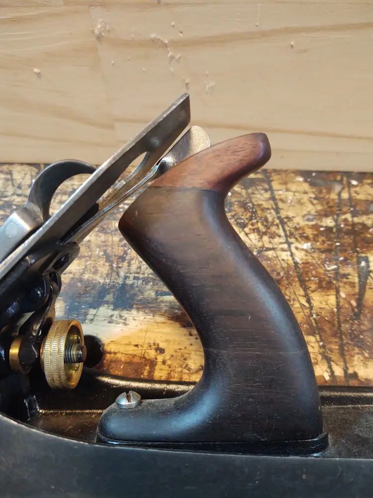 The Tote has been repaired, and the plane has been restored. This plane has been sharpened with a slight camber (as a Jack plane) for semi rough work (see photos). All parts appear to be original and typical to the #5414 type 2 including the horseshoe lateral.