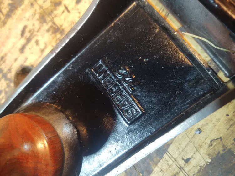 I'll let the pictures speak for themselves. New rosewood custom made furniture. The plane has been restored with some remanence of very light pitting with nothing that will hinder performance and is not very noticeable. . . . The Sargent Autosets are harder to find than their Stanley counterparts. They make exceptional users and are great collector items. . Interesting Note: The patents for the Sargent Auto-Set planes, Patent #1,124,325 by Albert A. Page on Jan 12, 1915, predates Stanley's patents for their Gage brand planes which was Patent 1,331,280 dated Feb 17 1920. . Length 22” Cutter width 2 3/8” Weight 5 lbs 13 ozs Type: Jointer . . (My #722-021923-4)